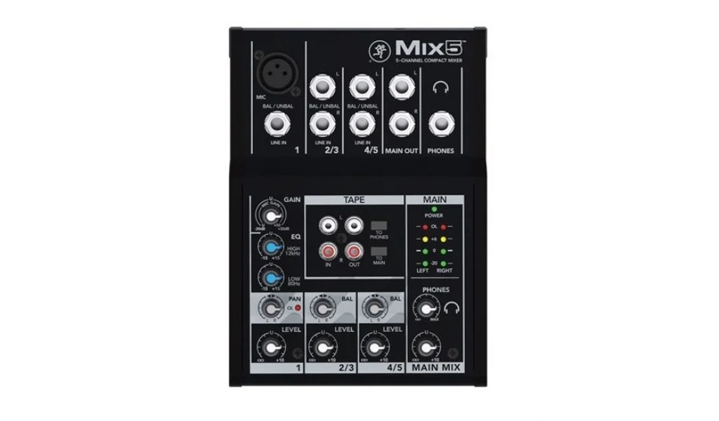 The Mackie Mix5 is a 5-channel compact mixer that features high quality components, a rugged metal chassis, and is designed for a variety of sound reinforcement applications. The mixer features one mic/line input, two stereo 1/4" line inputs, and is capable of accommodating dynamic microphones, keyboards, DJ setups, portable music players, and more.