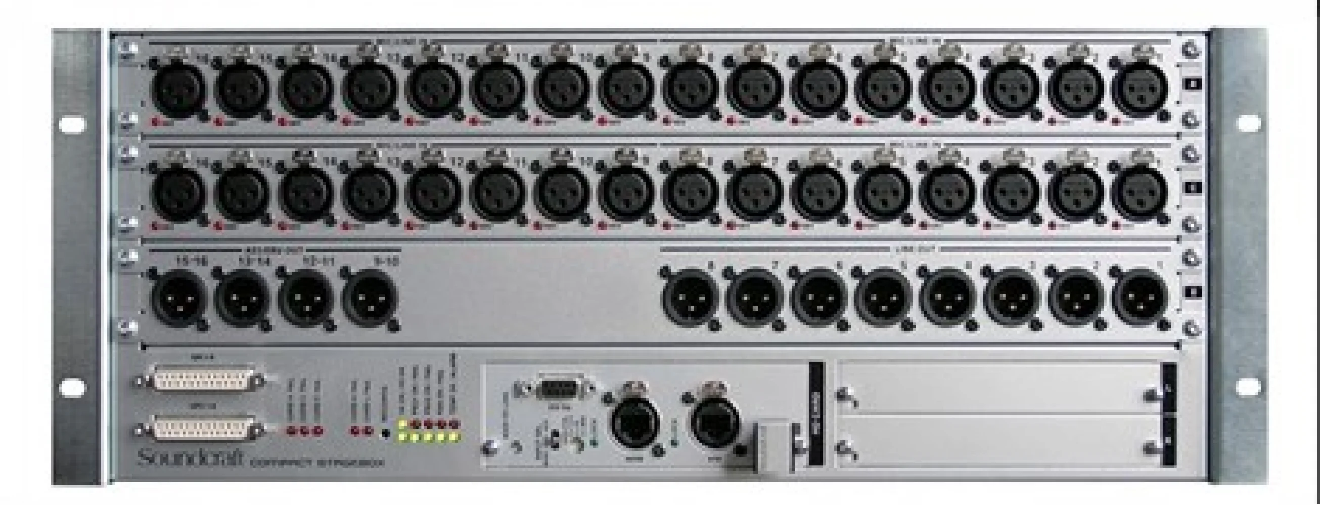 The Soundcraft Compact Stagebox offers a high density of I/O connections in only 4U of rack space. The modular unit is fully configurable but is offered with a standard configuration of 32 mic/line inputs, 8 line outputs, 8 channels of AES/EBU outputs and 2 expansion slots for standard Studer D21m I/O cards. The D21m is the I/O architecture for Studer as well as Soundcraft digital mixing systems and allows connection to most popular digital formats, including CobraNet®, AVIOM A-Net®16, Ethersound, ADAT and RockNet. A MADI recording interface can also be fitted to the expansion slots.
