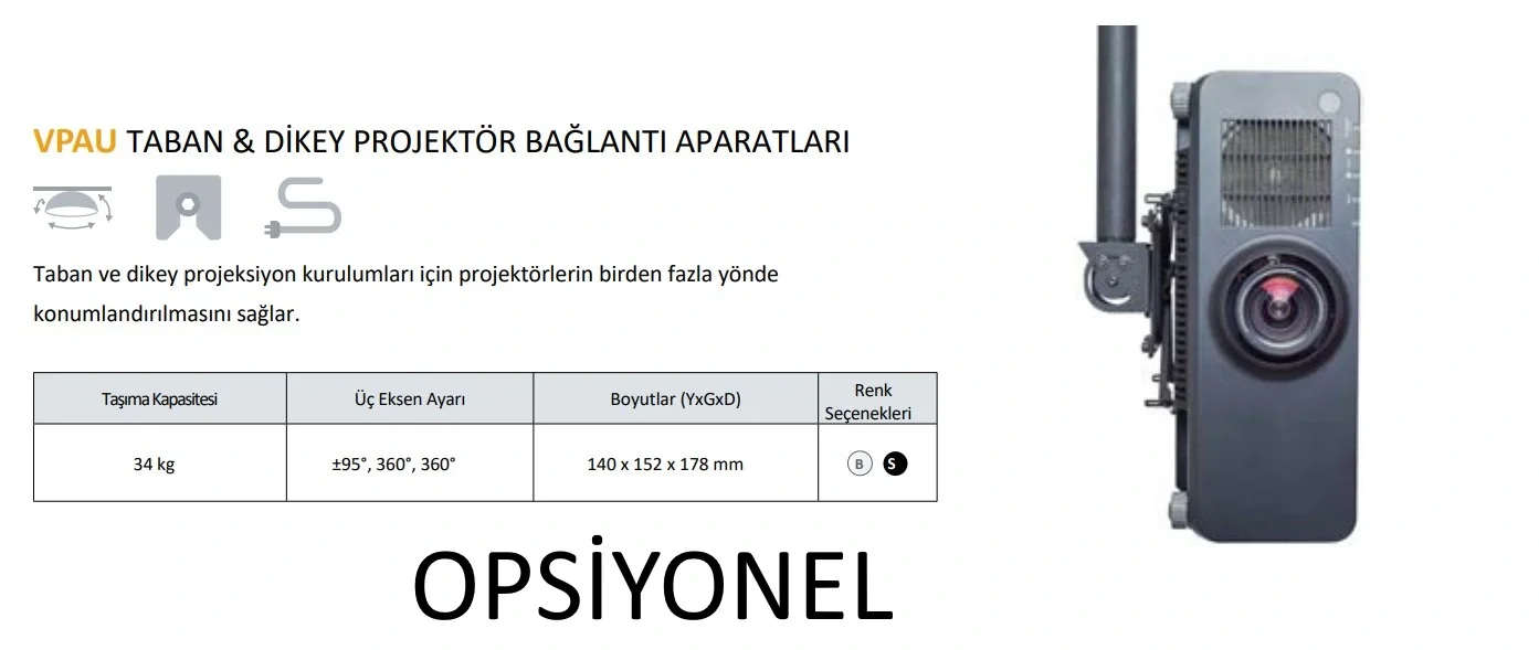 Hızlı ve hassas projektör kurulumu için bağımsız yatay eğim, dikey eğim ve rotasyon ayarları.