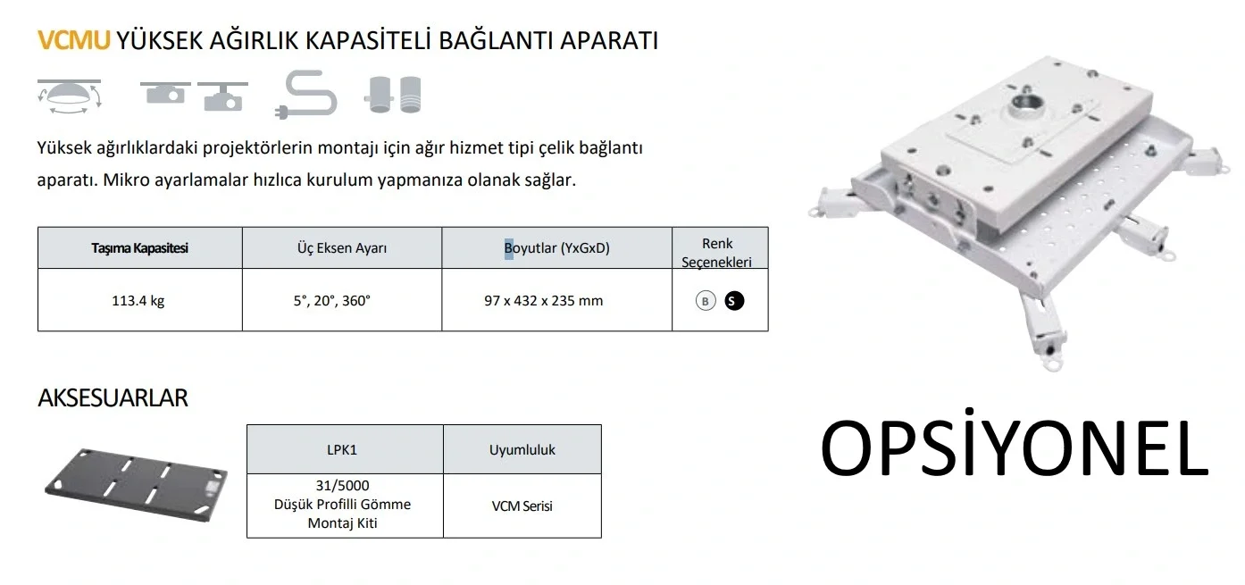 Bu montaj, ağır LCD / CRT projektörlerini monte etmek için ihtiyaç duyduğunuz güçlü desteği sağlar. Mikro ayarlamalar, kurulum işlemini hızlı bir şekilde gerçekleştirmenizi sağlar. VCMU montajı, en ağır iş projektörleri ile uyumlu olan evrensel HBU bağlantısı içerir.