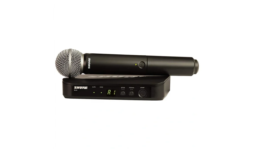 The BLX24 Vocal Wireless System with SM58 Mic from Shure includes a BLX4 wireless receiver and a BLX2 handheld transmitter with an SM58 microphone.