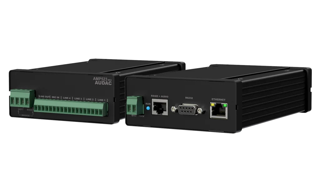 AMP523, dört stereo line girişe ve bir fantom güçlü dengeli mikrofon girişine sahip entegre web tabanlı kontrol üniteli bir Mini Stereo Amplifikatördür. 2 x 15 Watt’lık bir çıkış gücüne sahiptir.