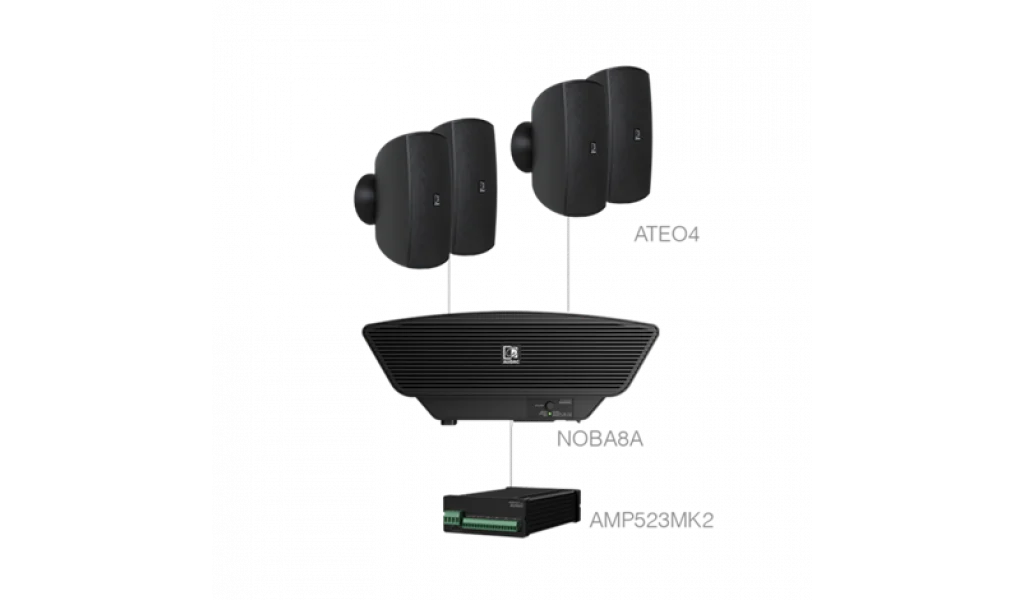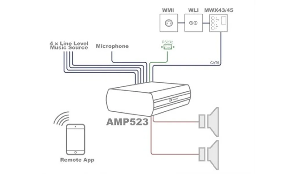 Kompakt boyutu ve yüksek verimi sayesinde, bir dolabın içine veya asma tavana rahatlıkla gizlenebilir, bir sıra veya masanın altına montaj edilebilir. Çeşitli stereo line girişleri, bir mikrofon bağlıyken laptoplar, CD veya MP3 Playerlar, Tabletler gibi farklı kaynaklar için aynı anda bağlantıya olanak tanır. Girişler, ses regülasyonu ve diğer fonksiyon kontrolleri arasında değişim farklı yollardan yapılabilir: entegre bir web sitesi sayesinde ek bir yazılım gerekmeksizin bir web tarayıcıya sahip herhangi bir bilgisayardan tüm fonksiyonlar kontrol edilebilirken, RS232 bağlantısı sayesinde bir bilgisayar ve hatta ev veya endüstriyel otomasyon sistemi gibi seri iletişimi destekleyen herhangi bir cihazla AMP523’ü kontrol etmek mümkündür. Sistemi kontrol etmenin bir diğer yolu da özel olarak geliştirilmiş uygulamalara sahip akıllı telefonlar ve tabletlerdir.
