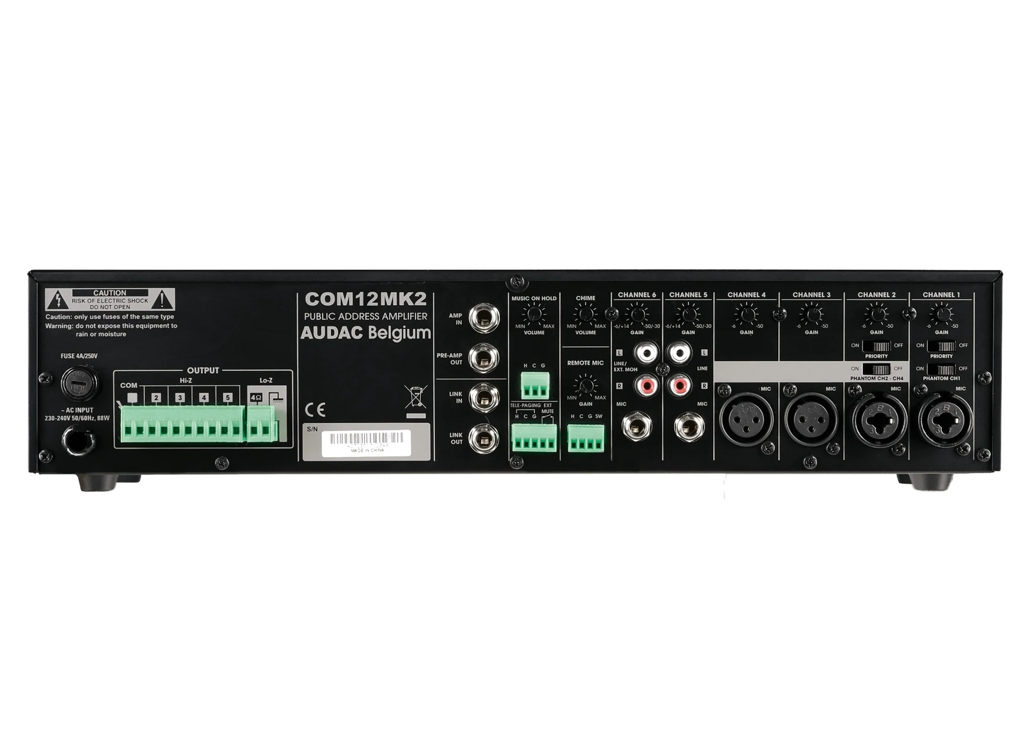COM12 ve COM24, 240W’a kadar güçleriyle ortak adresli amplifikatörleridirler. Her türden bağlantı amaçları için çok çeşitli giriş olasılıklarıyla tasarlanmışlardır. Mic / Line level, 4 balanced Mic / Line girişleri arasında değiştirilebilen, 2’sinin de XLR/Jack hibrid konektörler aracılığıyla kullanıldığı yerde devreye giren ve böylece önceliği sağlayan fantom güçlü, 2 dengesiz stereo line seviyesi girişle donatılmıştır. Bu şekilde maksimum 3 dengeli mikrofon bağlanabilir.