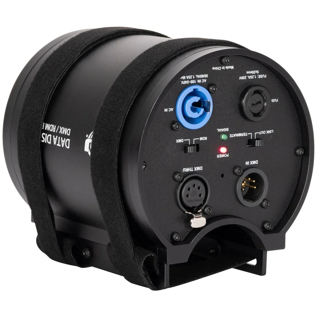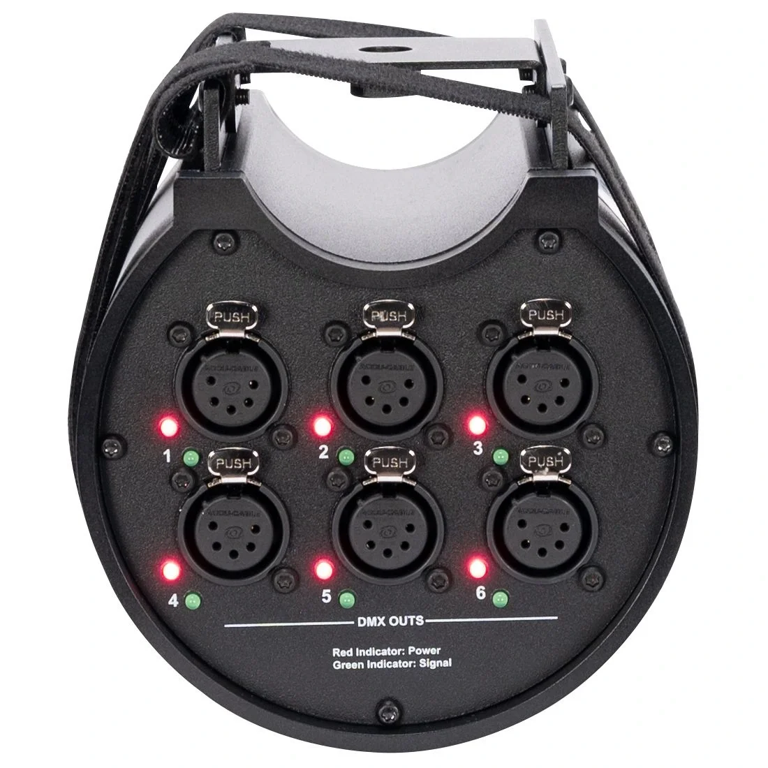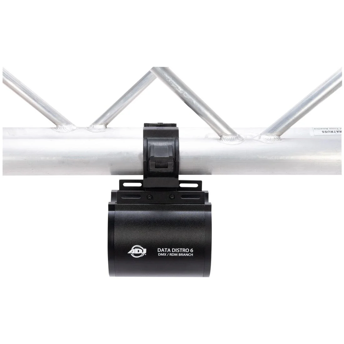 ADJ Data Distro 6, profesyonel aydınlatma sistemlerinde DMX512 ve RDM sinyallerini dağıtan kompakt 6-way data splitter'dır. 1x 5-pin XLR input, 1x thru ve 6x output ile sinyal kaybı olmadan güvenilir dağıtım sağlar. Truss mount (Velcro strap veya M10 clamp) tasarımıyla sahne rig'lerine kolay entegrasyon sunar. Termination ve protocol switch ile esnek kurulum – indoor kullanım için IP20 koruma, tiyatro, konser, gece kulübü ve etkinlik aydınlatması için idealdir.