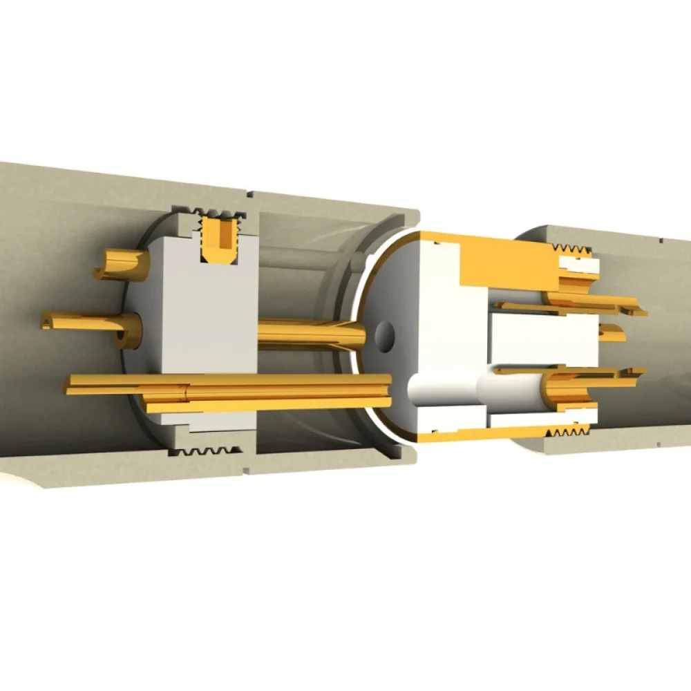 - Dişi ucun temas pimi, birleştirme fonksiyonu ile PTFE izolatörün içine sabitlenir.