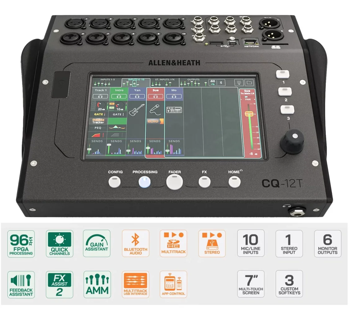 Allen & Heath CQ12T, dokunmatik ekranını ve fiziksel kontrollerini kullanarak veya uzak cihazlar aracılığıyla kontrol edilebilirliğini genişletmek için kablolu veya bluetooth ile bağlanarak yerel olarak çalıştırılmak üzere tasarlanmış ultra kompakt bir dijital ses mikseridir.