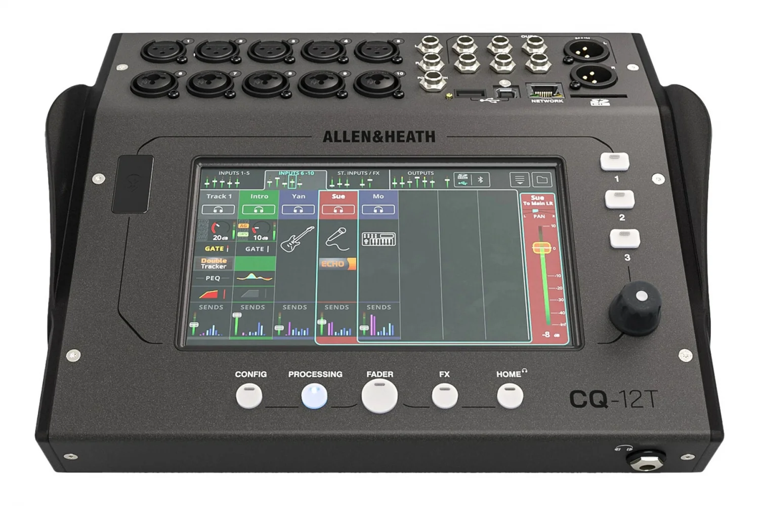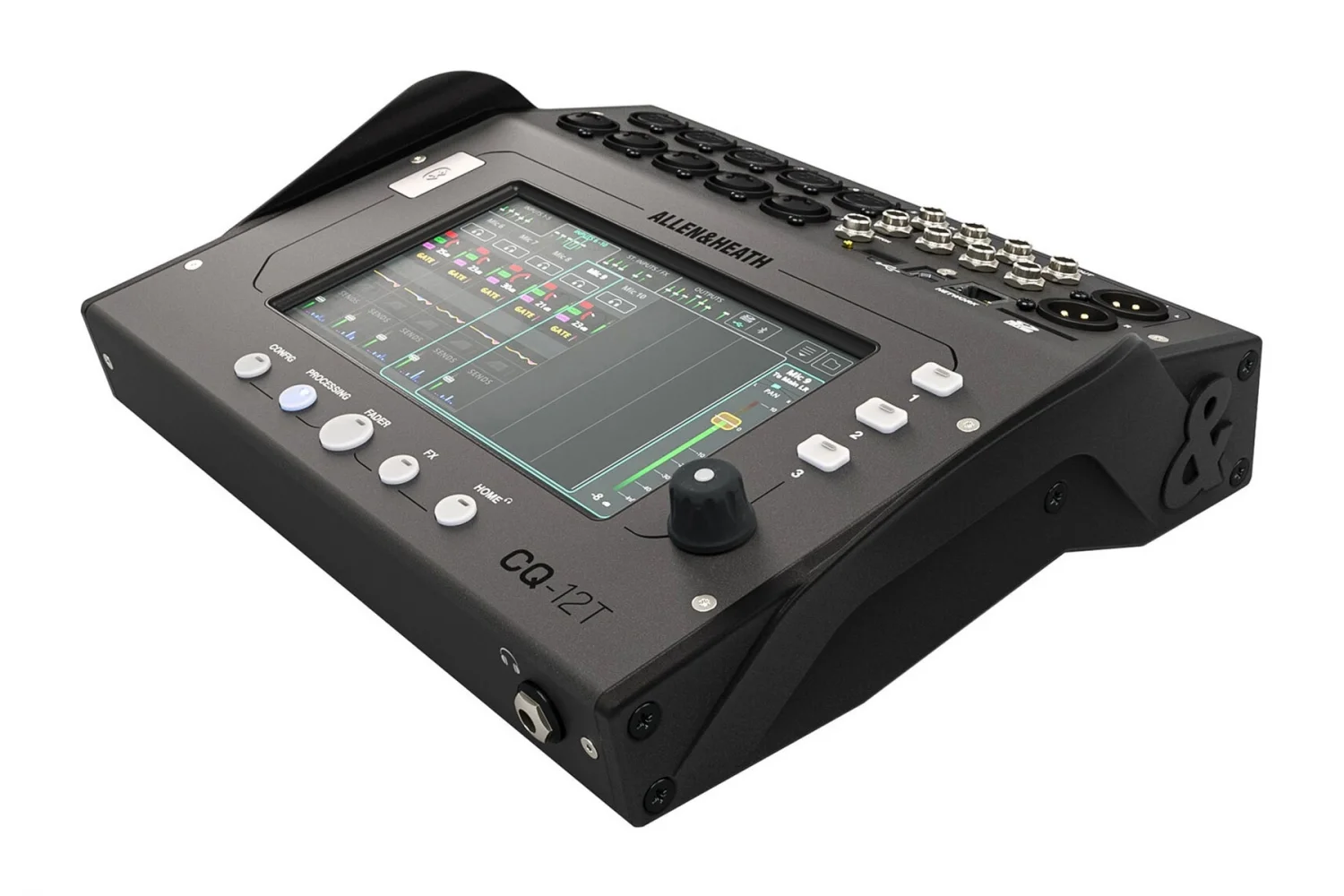 Dokunmatik ekranın avantajı, kullanımının kolay ve kompakt olmasıdır; ünite çok sayıda kontrolü ve bağlantıyı küçük bir alana sığdırır; kontrolünüzü genişletmek ve miksaj yapmak için A&H CQ-MixPad uygulamasını da kullanabilirsiniz. hareket.
