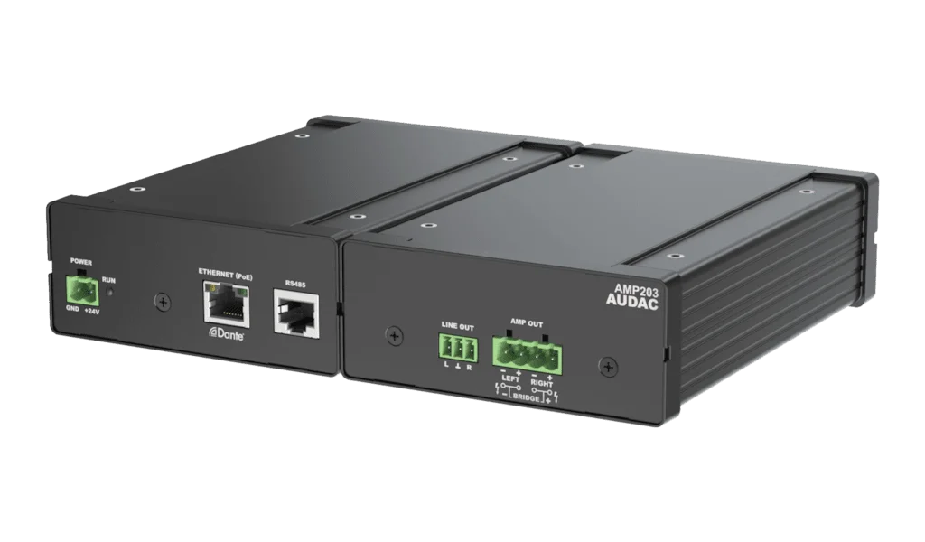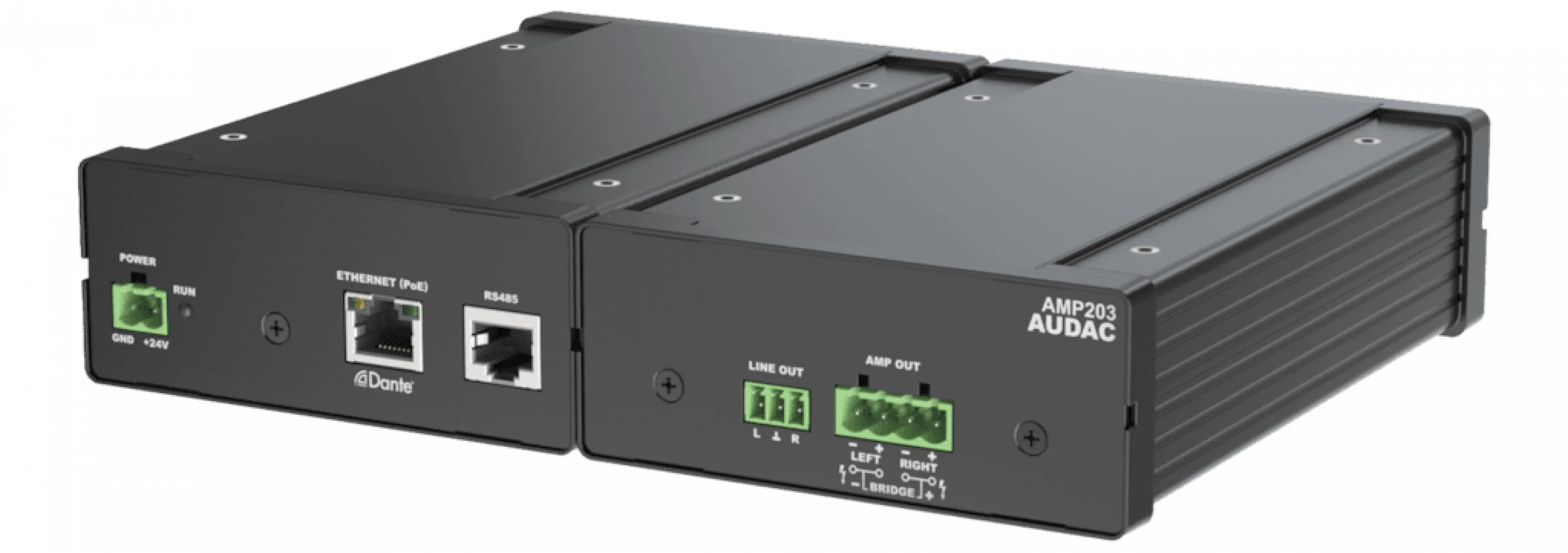 Dante mini stereo amplifier,4 ch Dante/Aes67 Input, 1 x RS485, 1 x Ethernet, TCP/IP and RS-485 Control, Stereo Line Output, 2 x 30 Watt Amplified Speaker Output, Bridge mode,Dimensions 108x44x165 mm, Weight 0.70 kg