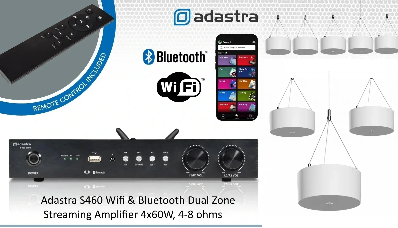 1 Adet Adastra S460 Mixer Ampli 4x60W Tablet, Cepten Kontrol,Spotify, Youtube, Soundcloud (Wiim Pro Gömülü)