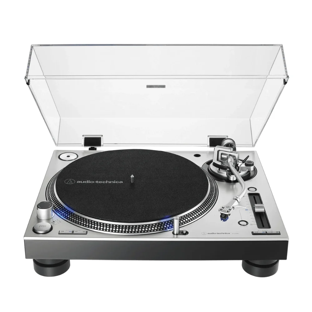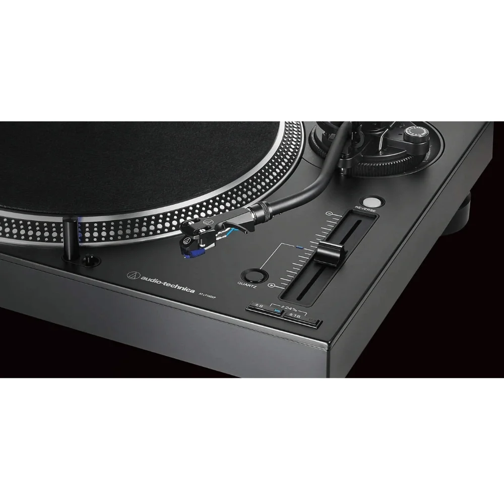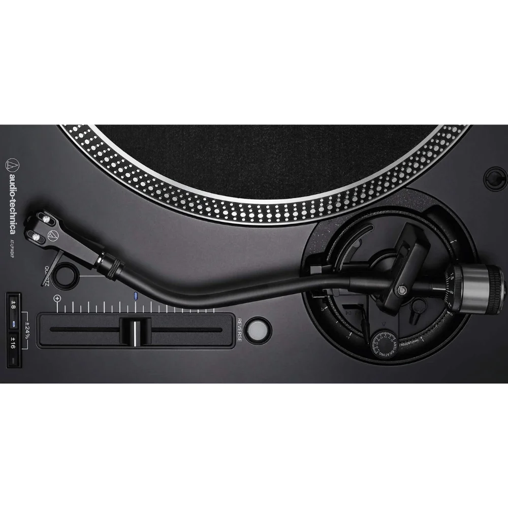 AT-LP140XP, tam manuel profesyonel DJ pikap, 33-1/3, 45 ve 78 RPM'de istikrarlı, eksenel döndürme sağlamak için yüksek torklu doğrudan tahrikli bir motora ve rezonans önleyici, kütle sönümlemeli, döküm alüminyum plakaya sahiptir. Yükseklik ayarı, ayarlanabilir izleme kuvveti (denge ağırlığı) ve ayarlanabilir dinamik anti-patinaj kontrolüne sahip S şeklindeki bir ton kolu ile donatılmıştır.