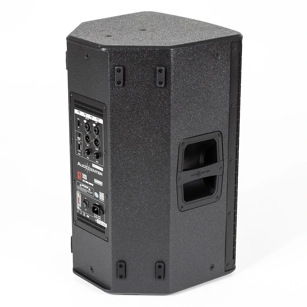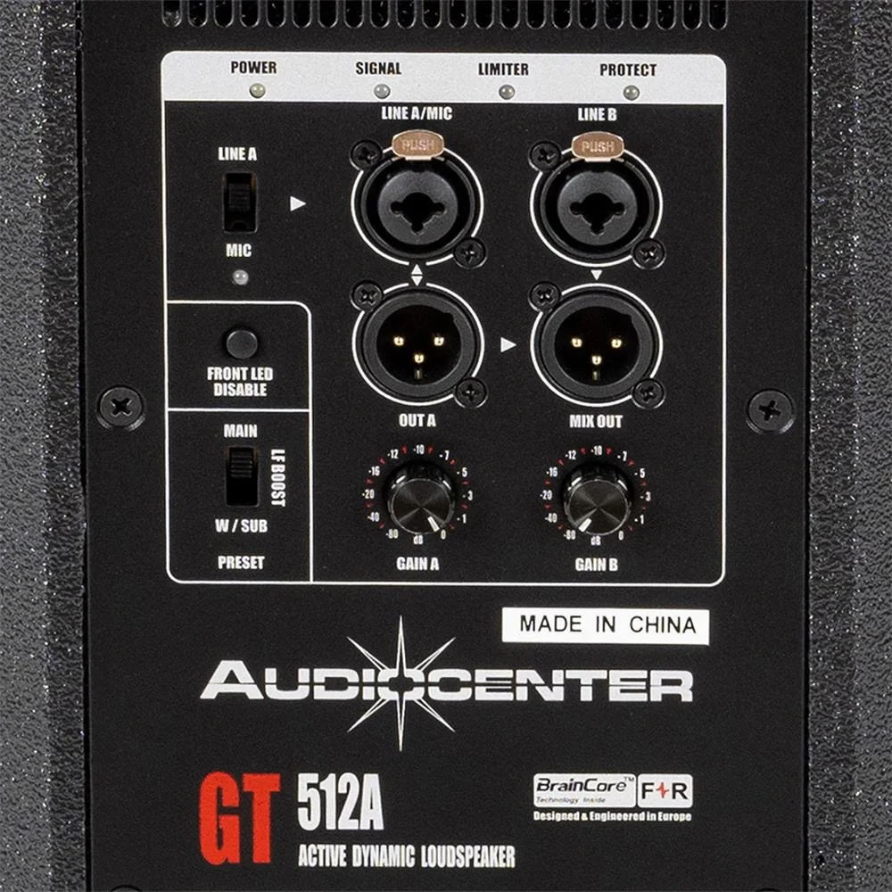 GT512A, 2× dişi XLR ve Mono jak 6.35 gibi çeşitli sinyal giriş seçeneklerine sahiptir. 2× erkek XLR çıkışları, hoparlörleri kolayca birbirine bağlama olanağı sunar. IEC güç konektörü, kullanıcıların hoparlörü kolayca güç kaynağına bağlamasını sağlar.