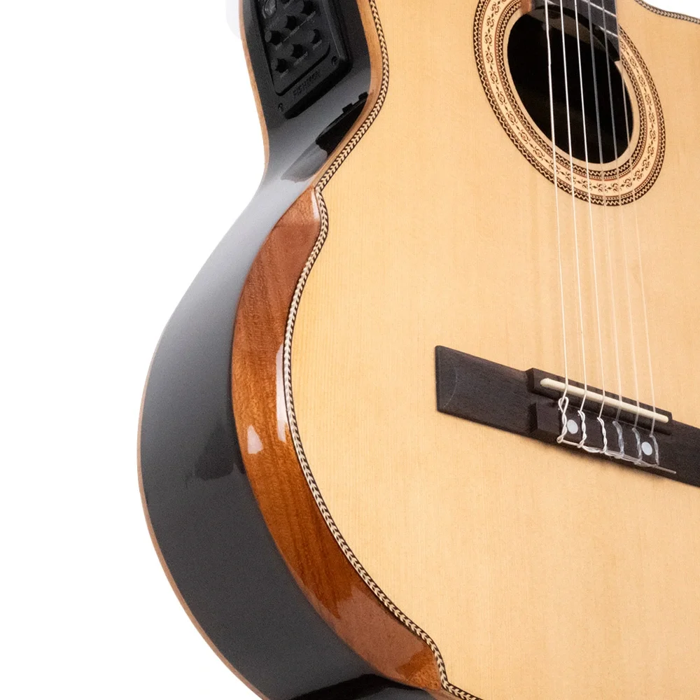 Ahşap ve ip motifli bağlama, gitarın kenarlarına zarif bir görünüm kazandırır. Bu küçük detay, gitarın genel estetiğini tamamlar.