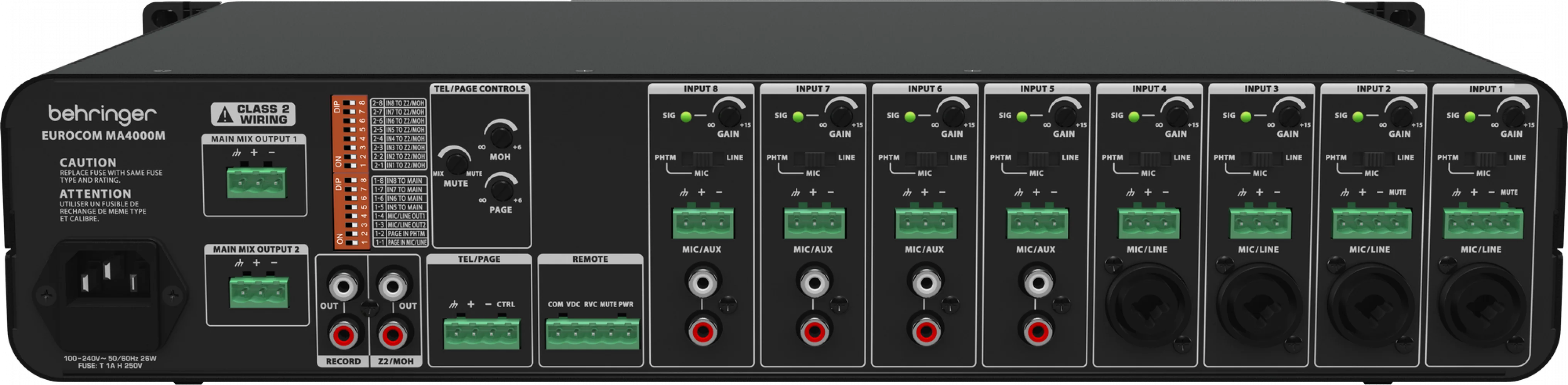 | Inputs | Mic/Line Inputs 1 and 2: 2x Combo XLR/TRS jacks 2x 4-pin Euroblock connectors (in parallel) Mic/Line Inputs 3 and 4: 2x Combo XLR/TRS jacks 2x 3-pin Euroblock connectors (in parallel) Inputs 5 to 8: 4x 3-pin Euroblock connectors (electronically balanced) Auxiliary Inputs: 4x Stereo RCA jacks (summed) Telephone/Page Input: 1x 4-pin Euroblock connector |