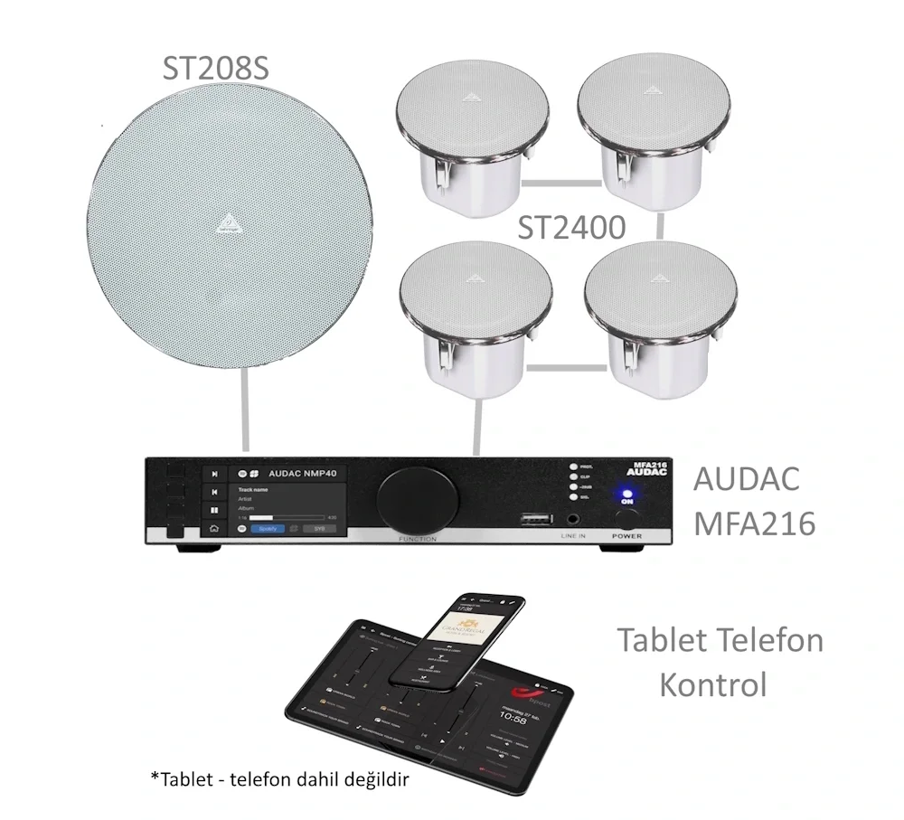 Audac MFA216 + 1 Behringer 208S Subwoofer + 4 adet Nano 4" Tavan hoparlörü.
