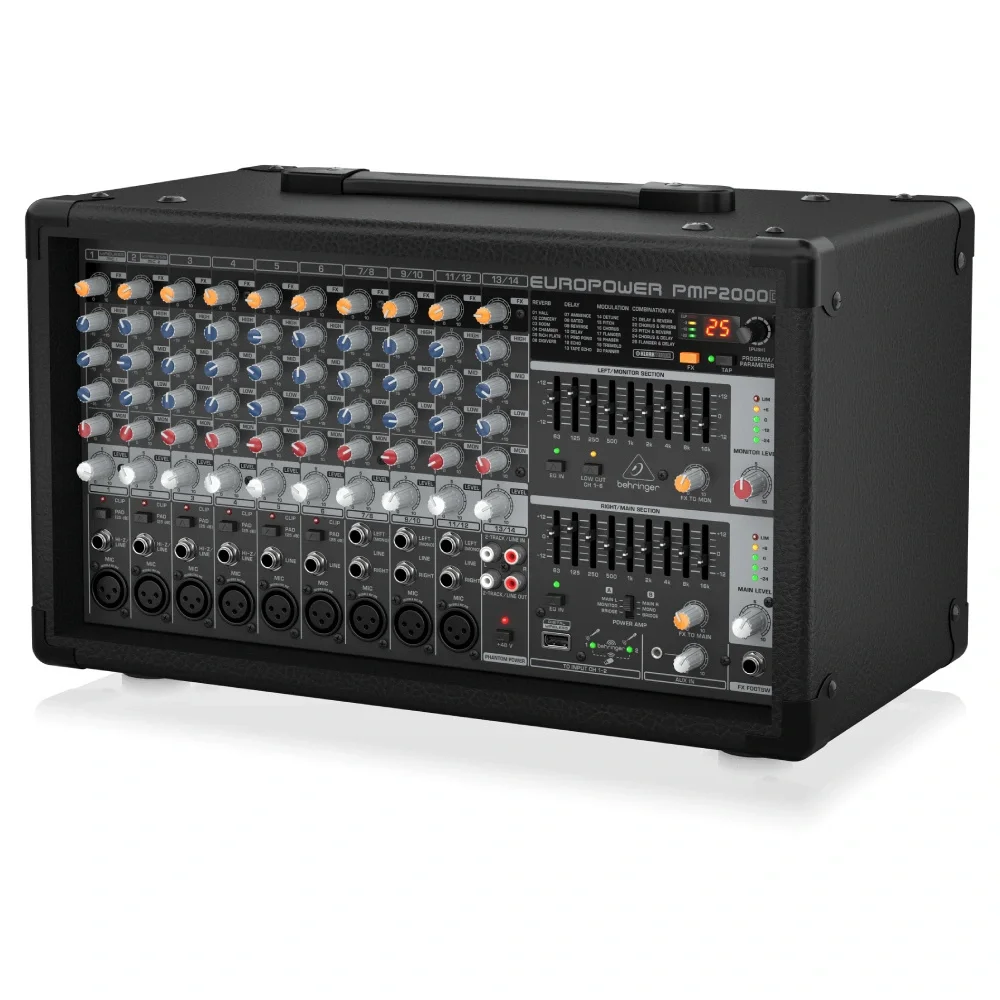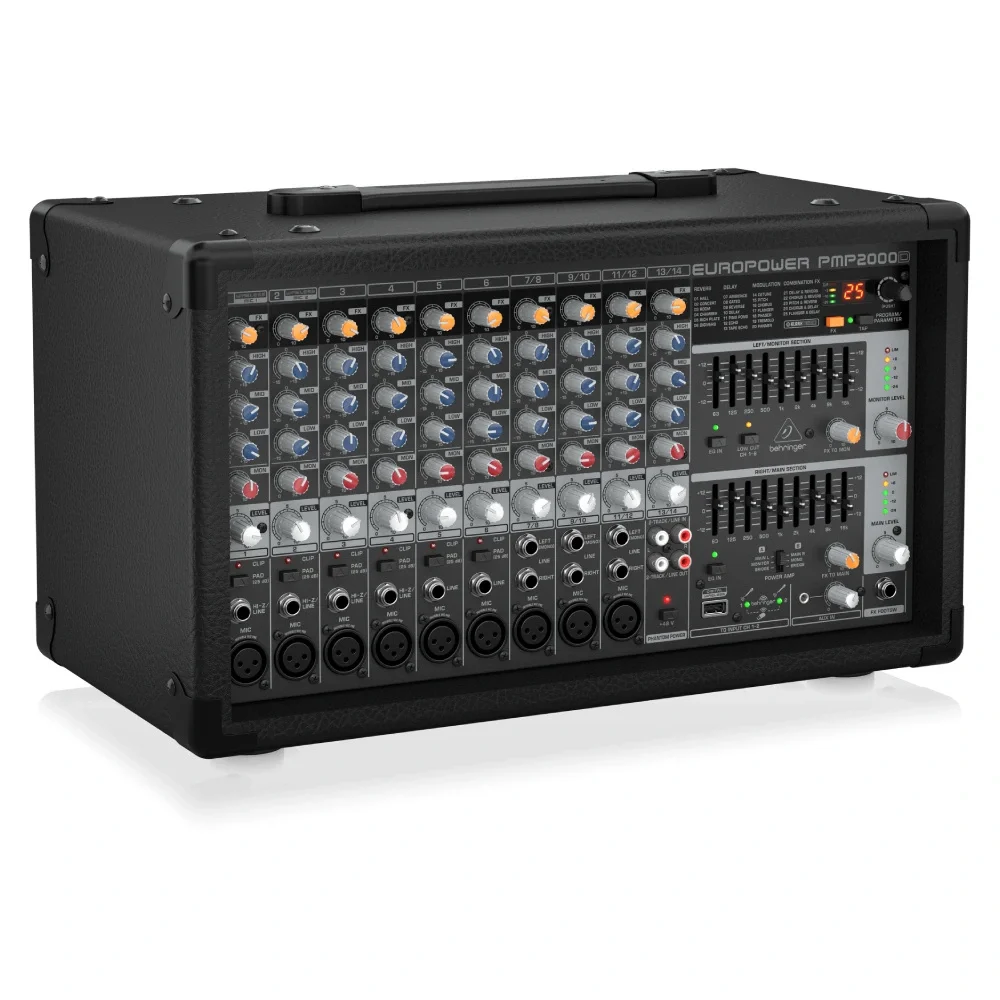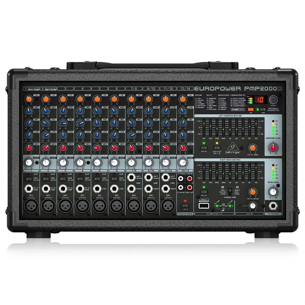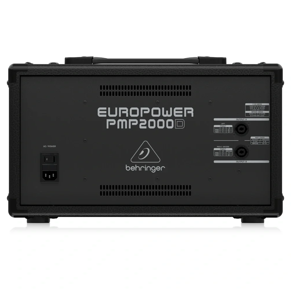 Behringer Europower PMP2000D'nin güçlü Class D amplifikatörü, orta ölçekli kulüp etkinlikleri ve mütevazı açık hava festivalleri için ana hoparlörleri ve monitörleri sürmek üzere 2000 watt (her kanal için 1000 watt) güç sunar. On dört kanal (6 mono ve 4 stereo) ve dokuz IMP mikrofon preamfisi, tam bir grup için yeterli giriş sağlar. Ayrıca, set aralarında telefonunuzdan müzik çalmanıza olanak tanıyan bir stereo yardımcı giriş mevcuttur. Behringer PMP2000D, Klark Teknik'in sunduğu reverb, delay ve pitch shifter gibi 25 dünya çapında dijital efekti içerir ve bu sayede miks içinde her bir parçanın kendi alanını bulmasına yardımcı olur.