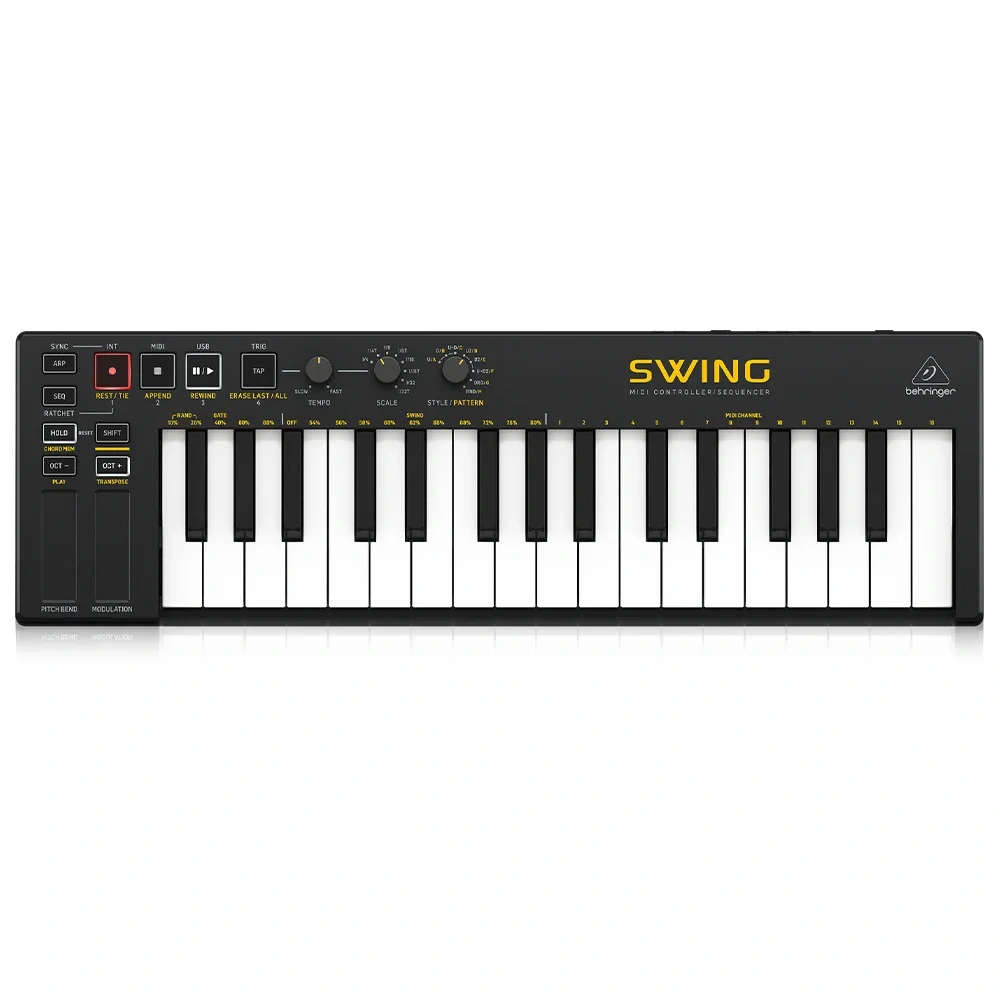 Behringer SWING, DAW'ınızdaki herhangi bir synthesizer veya sanal enstrüman üzerinde USB veya MIDI aracılığıyla tam kontrol sağlar. 32 kompakt boyutlu tuş ve perde ve modülasyon dokunmatik şeritleri ile birleştirilmiş 8 notalı polifonik dizili 64 adımlı bir sıralayıcıya sahip olmak, kompakt ve taşınabilir bir pakette kendinizi ifade etmenin sınırsız yollarını sunar.