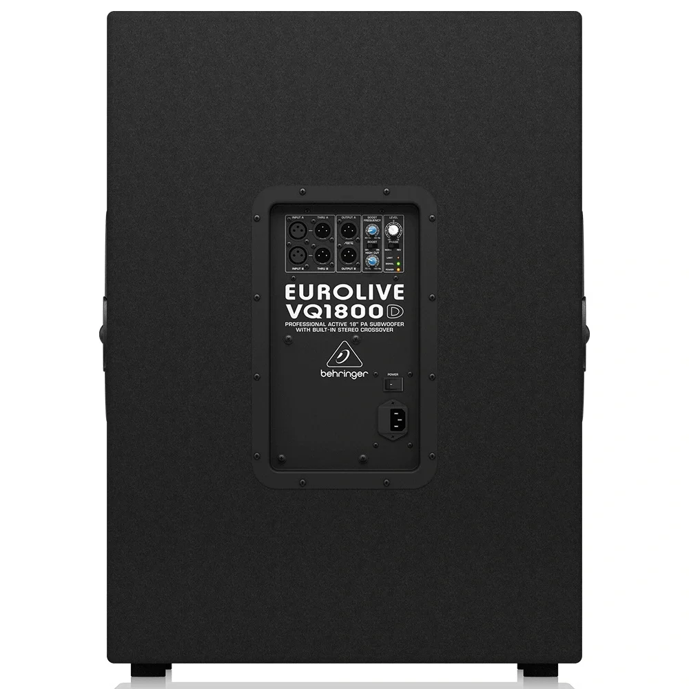 Behringer EUROLIVE VQ1800D 18" Aktif 500W subwoofer . Profesyonel canlı ses destek uygulamaları için tasarlanmıştır Enerji verimi DSınıfı 500W amplifikatör tarafından desteklenmektedir. Dahili termal ve klips sınırlayıcıları, hoparlörü ve yükselticiyi aşırı yüklenmeye karşı korur. Dışta, kutuda koni ve ergonomik tutamakları kolay taşıma için korumak için çelik ızgara bulunmaktadır. Hoparlörleri ticari ayırıcı direklerle monte etmek için bir kutup soketi içerir.G / Ç için, subwoofer'da iki dengeli XLR Girişi, iki dengeli XLR çıkışı ve ek hoparlörlere bağlanmak için iki XLR Thru jakı bulunur. Arka panel, ayarlanabilir bir ve değiştirilebilir +6 dB bas yükseltme düğmesini, 40 ila 90 Hz arasında, sinyalin polaritesini ters çevirmek için bir faz düğmesi, bir 70 ila 150 Hz yüksek frekanslı kesme düğmesi ve bir ses seviyesi kontrolü içerir.Yüksek geçiş filtresi XLR Thru devresini etkilemez. Üç LED gösterge ışığı seti, subwoofer'a giden gücü, bir sinyalin varlığını ve sınırlayıcı devreye girdiğinde gösterir.