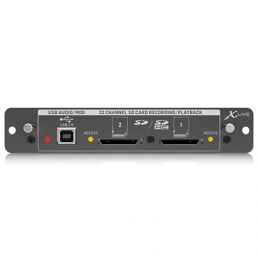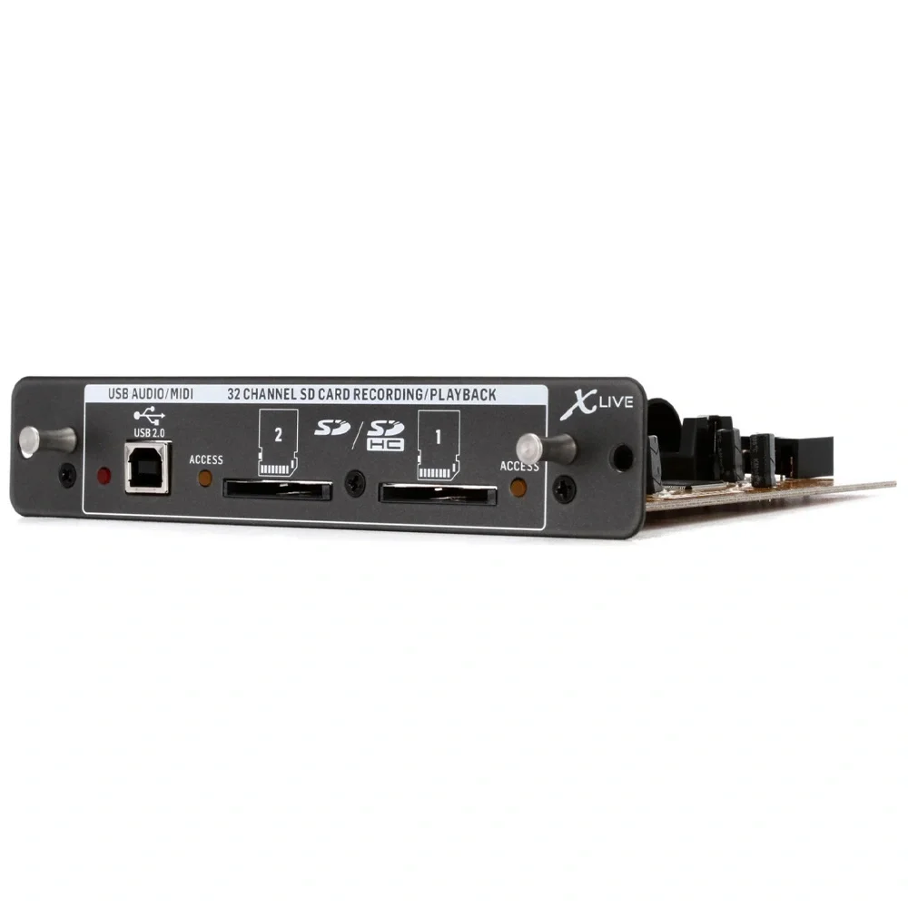 X-LIVE arayüz kartı, yıllardır X32 konsollarında standart olarak kullanılan X-USB kartının zaten mükemmel olan performansını genişletiyor. USB 2.0 üzerinden aynı 32 kanallı çift yönlü ses I/O'su mevcuttur ve kayıt ve çalma için 32 kanalın yanı sıra HUI/Mackie Control emülasyonu ile DAW'ınızın uzaktan çalıştırılmasını sağlar. Çift SD/SDHC yuvasının eklenmesi, SD kartların maksimum kapasitesine kadar tutarlı oturumlarda 32 kanala kadar sıkıştırılmamış WAV dosyasının tamamen bağımsız olarak kaydedilmesini ve oynatılmasını sağlar. Dizüstü bilgisayar olmadan çok kanallı kaydın yanı sıra sanal ses kontrolleri, canlı backing-track desteği, doğru işaretleyici kullanımı ve manipülasyonu ve PC, Android * veya iPad * uygulamaları ve X-TOUCH kontrol yüzeylerinden tam uzaktan çalıştırma. Tüm bunlar X-LIVE'ın X32'nize getirebileceklerinin yüzeyini ancak çizmeye başlar.