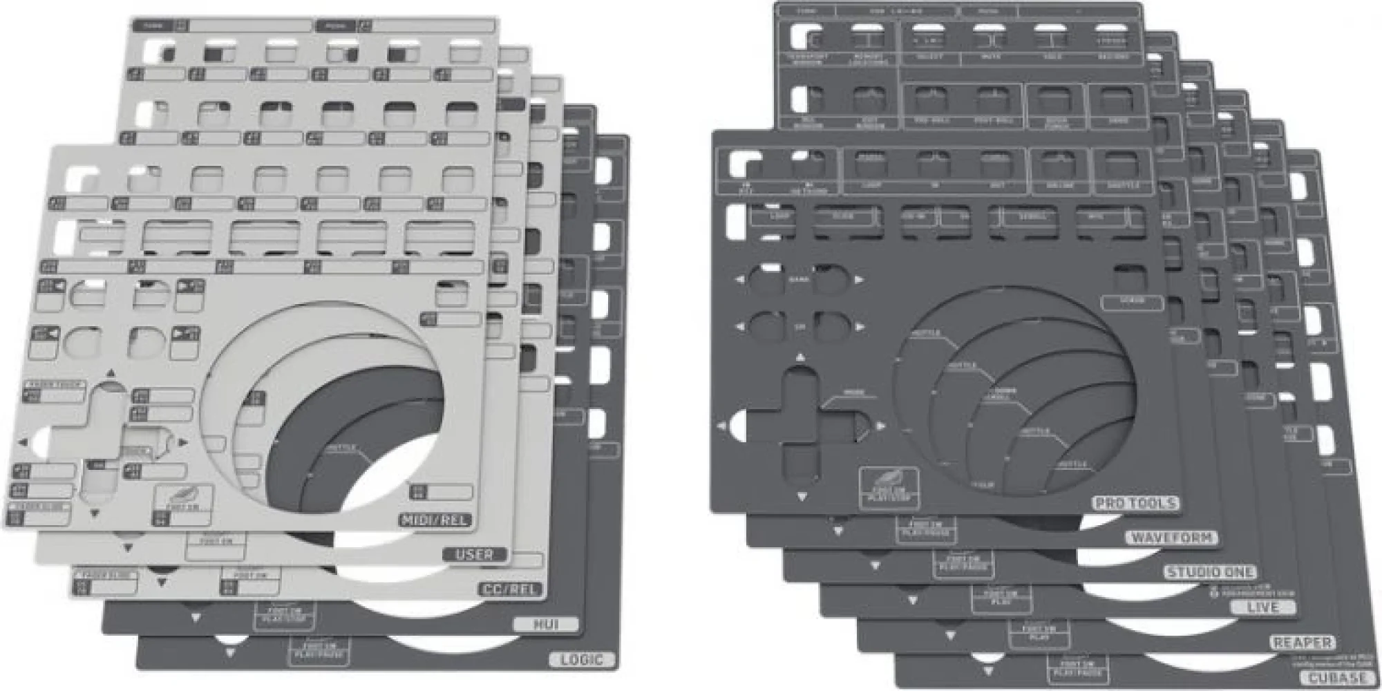 X-TOUCH ONE, her uyumlu müzik prodüksiyon yazılımıyla sorunsuz entegrasyon için Mackie Control, HUI ve MIDI iletişim protokollerini destekler. Üst panelde yazdırılan metin, standart Mackie Control MC protokolüne karşılık gelir. Ayrıca, düğmelerden herhangi birine belirli MC işlevleri atamanıza izin veren MC Kullanıcı modu seçeneğiniz de vardır (Ana/Kanal bölümündeki ilk beş düğme hariç). En popüler uyumlu DAW'larla çalışmayı kolaylaştırmak için, X-TOUCH ONE'ınız için her DAW için tipik düğme işlevlerini gösteren etiketli katman şablonları ekledik.