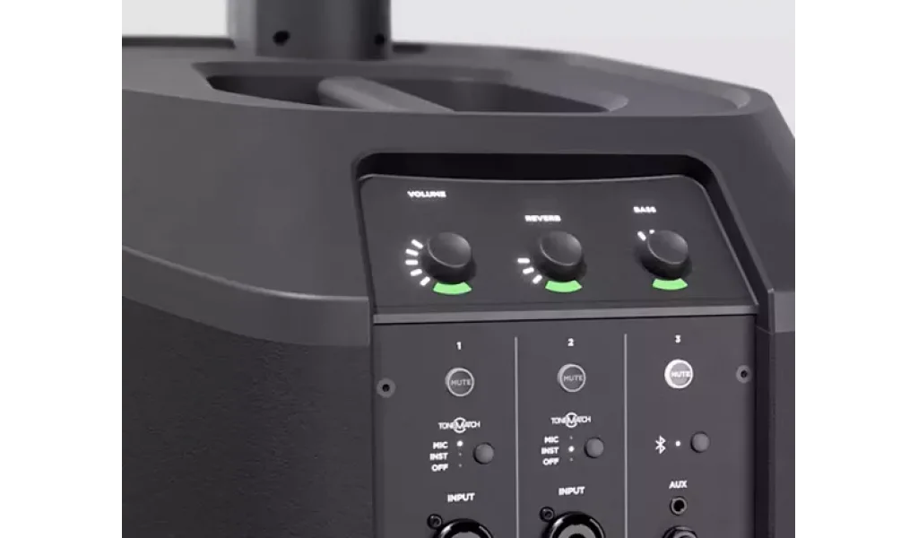 İki birleşik XLR-1/4” fantom beslemeli giriş, 1/4" ve 1/8" (3,5 mm) aux girişi ve ayrıca Bluetooth ® akışı ile dahili mikser aracılığıyla çeşitli ses kaynaklarını kolayca bağlayın ve erişim sistemi EQ ve Işıklı kontroller aracılığıyla ToneMatch ön ayarları, ses seviyesi, ton ve yankı