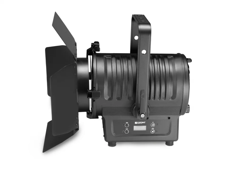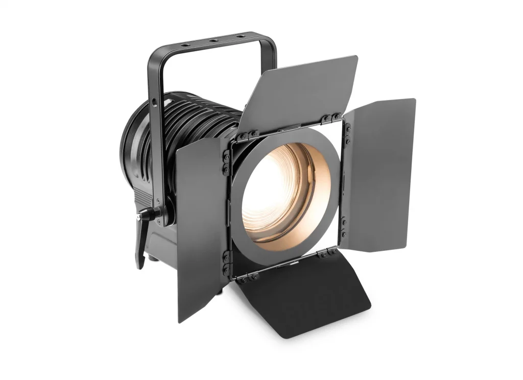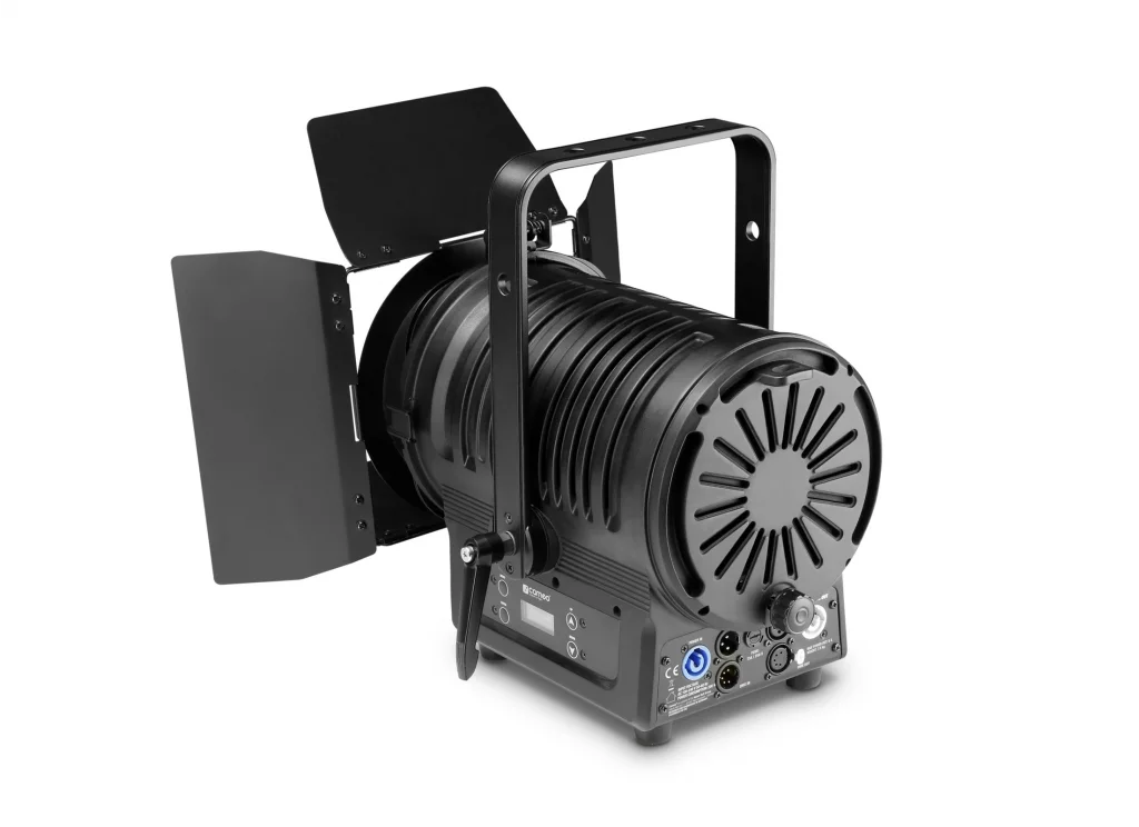 The Cameo TS 200 WW is a versatile theatrical spotlight with a Fresnel lens and manual zoom that allows the beam angle of its uniform, soft-edged light beam to be continuously adjusted from 14° to a wide 38°. The RDM-capable spotlight's 180-watt warm white LED with 3,100 Kelvin color temperature achieves a high luminous intensity of 67,500 lux at a distance of 1 meter. With an extremely high color rendering index of 96, the spotlight displays colors naturally and without distortion. .