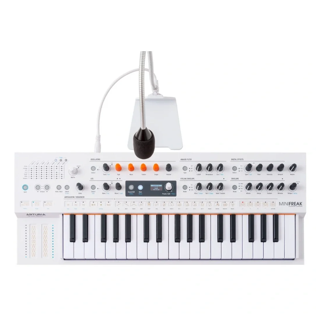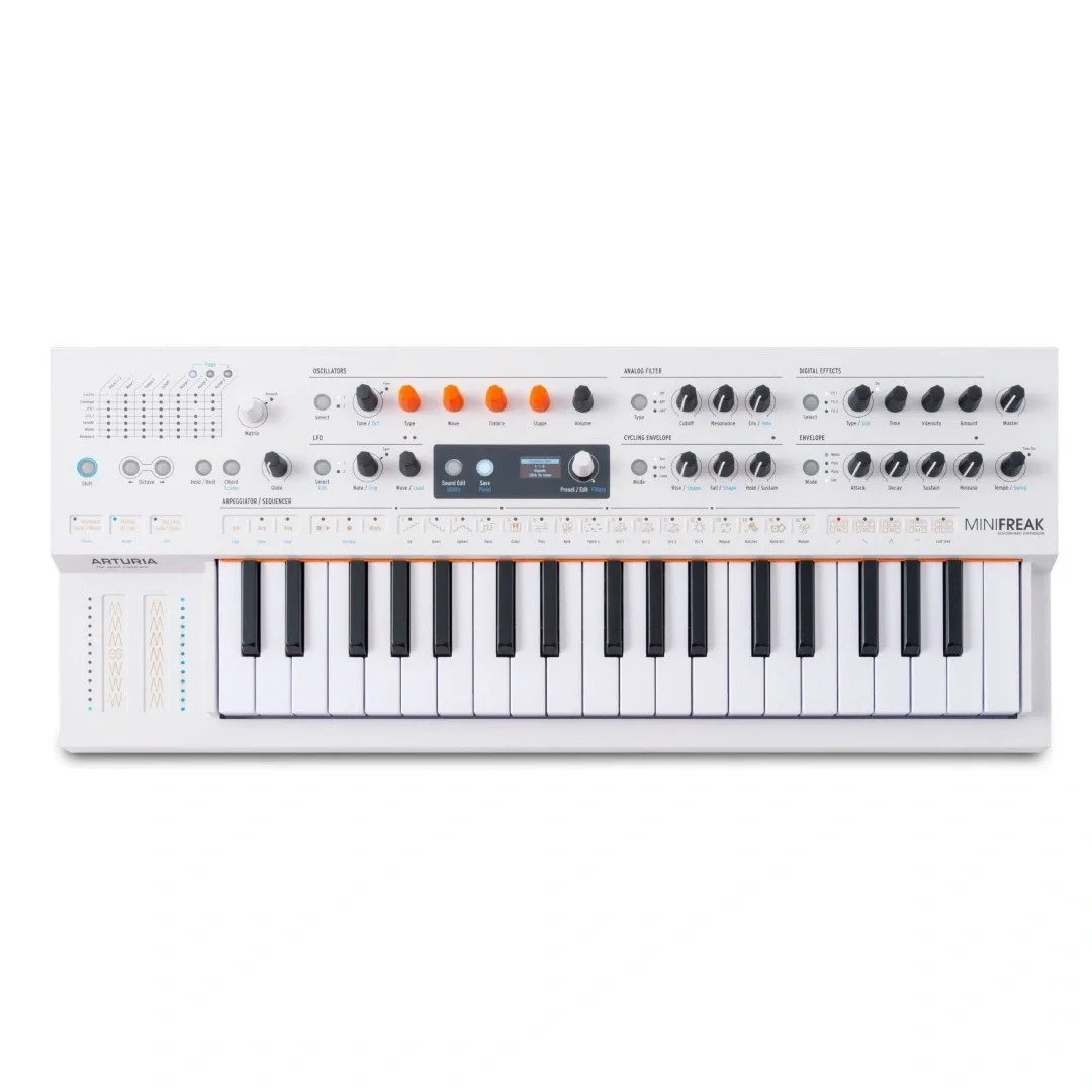 Sesinizi serbest bırakın, gerçekliği bozun ve kaosa cesurca dalın – MiniFreak, beyaz-turuncu cesur görünümüyle geri dönüyor; sesi isteğinize göre büken bir vokoderle donatılmış halde.