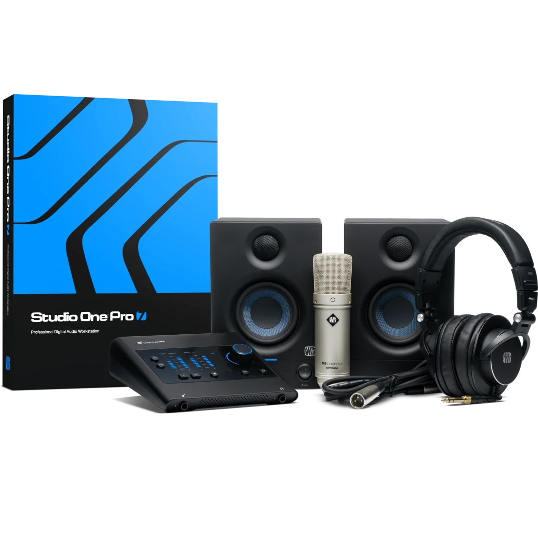 Ev stüdyosu için eksiksiz kayıt paketi: USB-C ses kartı, Studio One Pro DAW kayıt yazılımı lisansı, Eris stüdyo monitörleri, kondenser mikrofon, stüdyo kulaklıkları ve daha fazlası.