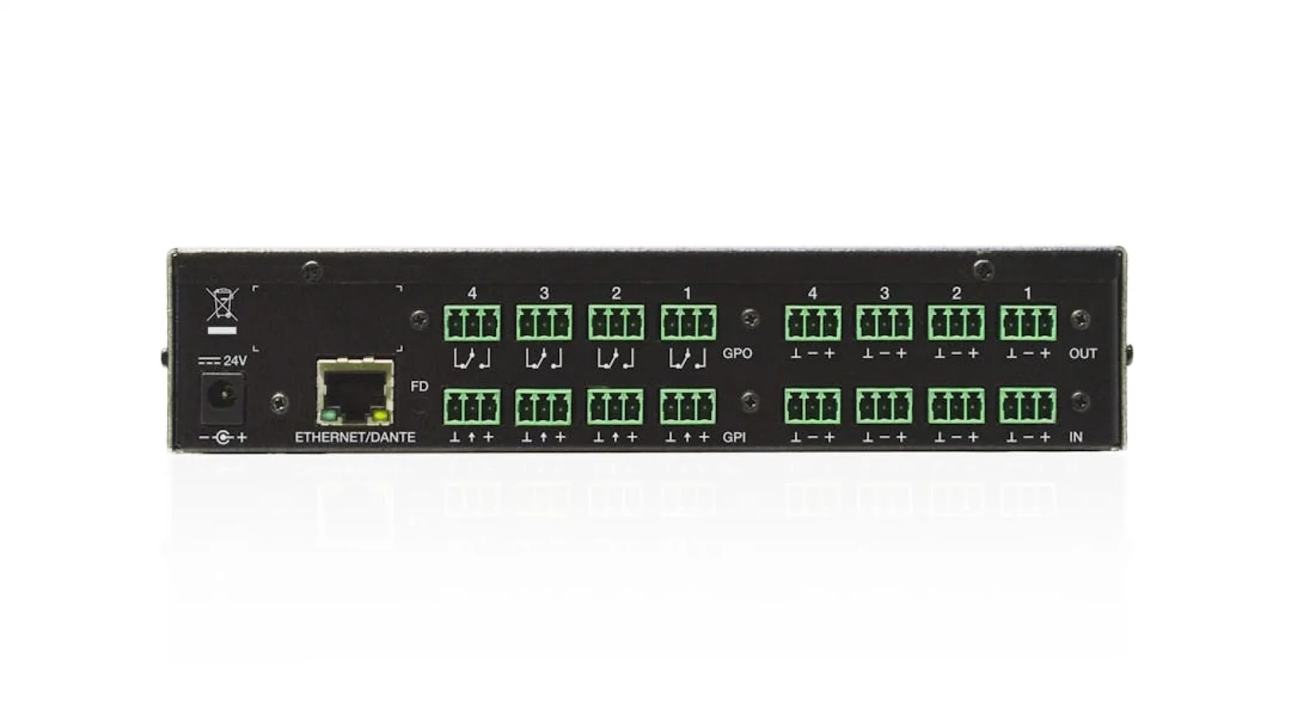 4 inputs/4 outputs DANTE (Audio Over IP) Break Out Box. It allows to convert 4 analogue audio signals into 4 DANTE channels and send them into an Ethernet LAN, as well as to take 4 DANTE channels from the Ethernet network and convert them to analogue audio signals. It includes 4 GPI (0-10VDC) and 4 GPO control ports (NO/NC relays). Can be used together with EclerNet DANTE ready products or as a stand-alone DANTE interface. PUM3 included: rack-mount accessory to mount 2 halfwidth RU devices in 1 standard width RU space. Dimensions 241 x 44(1RU) x 152 mm. Weight 1.1 kg