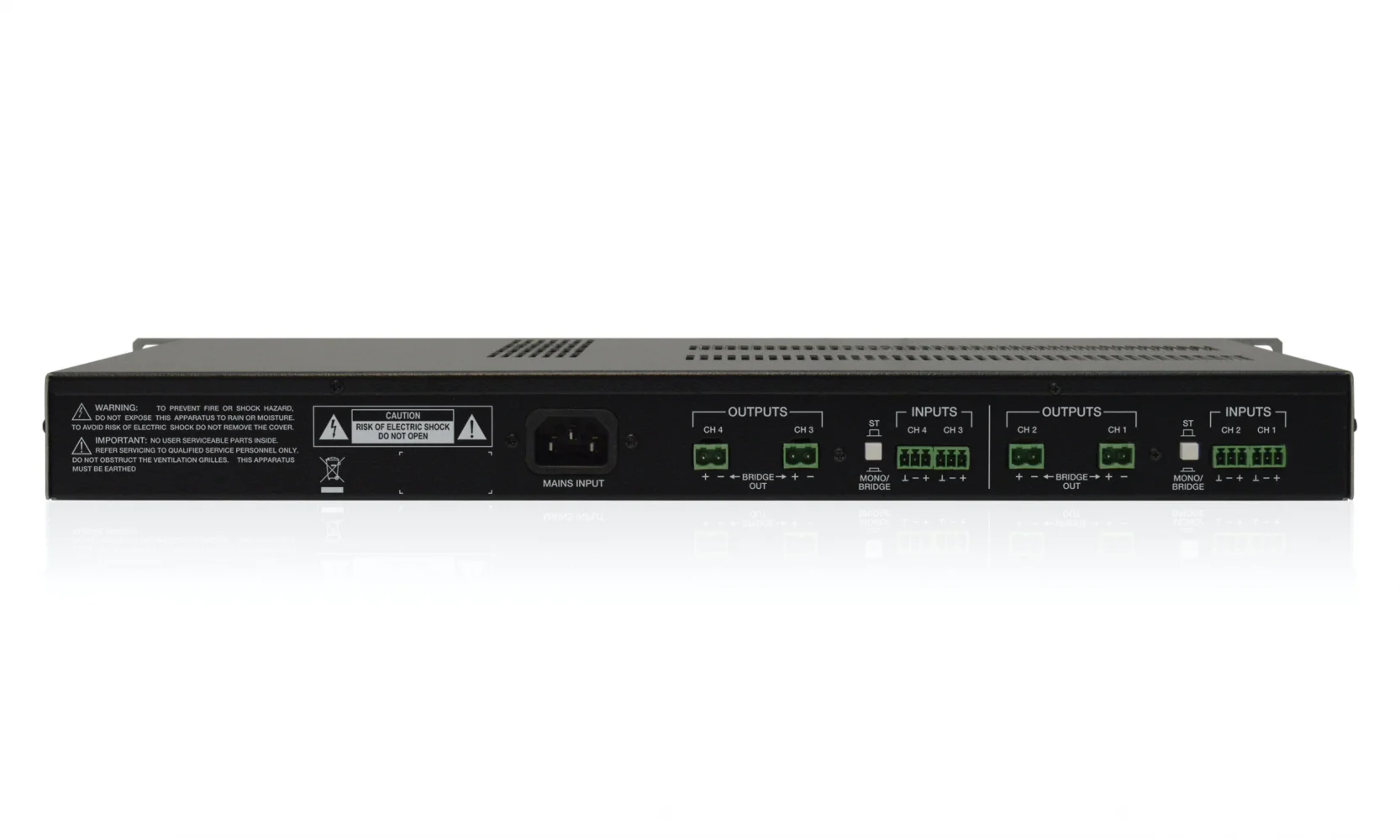 4x150 WRMS @ 4 Ω, high efficiency multichannel amplifier (class D). Auto stand-by function, fanless design 100% silent. 2 Bridged Channels @ 8Ω 280 WRMS. Dimensions 482.6 x 44(1RU) x 221 mm. Weight 3.60 kg