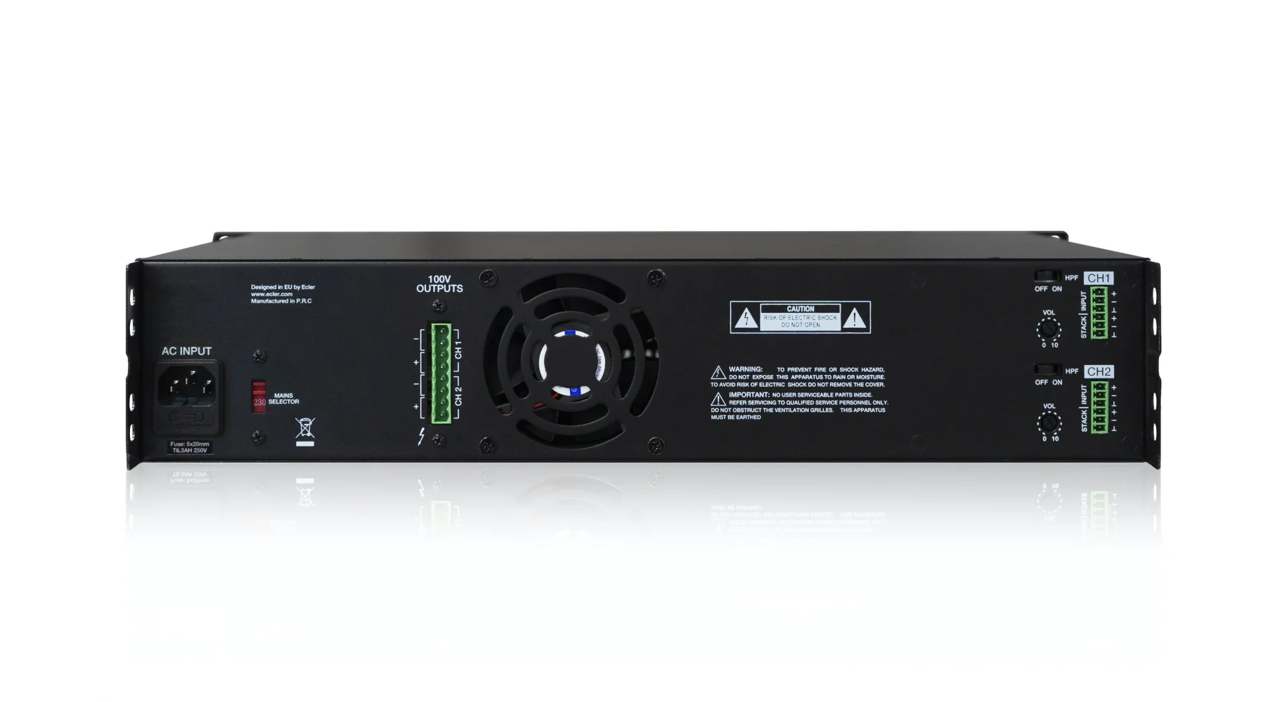 Multichannel amplifier with 2 x 500 WRMS @ 100V (high impedance) powered outputs. Includes 2 mono