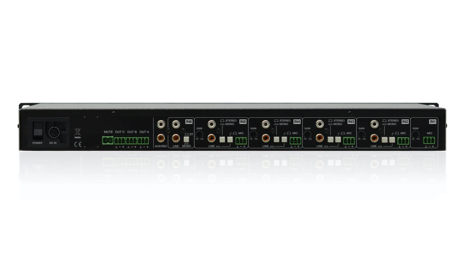 6 inputs and 3 outputs installation audio mixer. Inputs: 1x MIC, 4x MIC/LINE ST, 1x LINE ST. Outputs: 1x ST (A/B) and 1x MONO (C). A/B output can operates in ST/MONO mode. Each input can be routed to output A, B and/or C. It includes a 3 band tone control section, talkover (priority) function assignable to each input over the mix bus, ST/MONO mix switch for A/B output and MUTE port for external dry contact triggering. Dimensions 482.6x44(1RU)x120 mm. Weight 2,1 kg