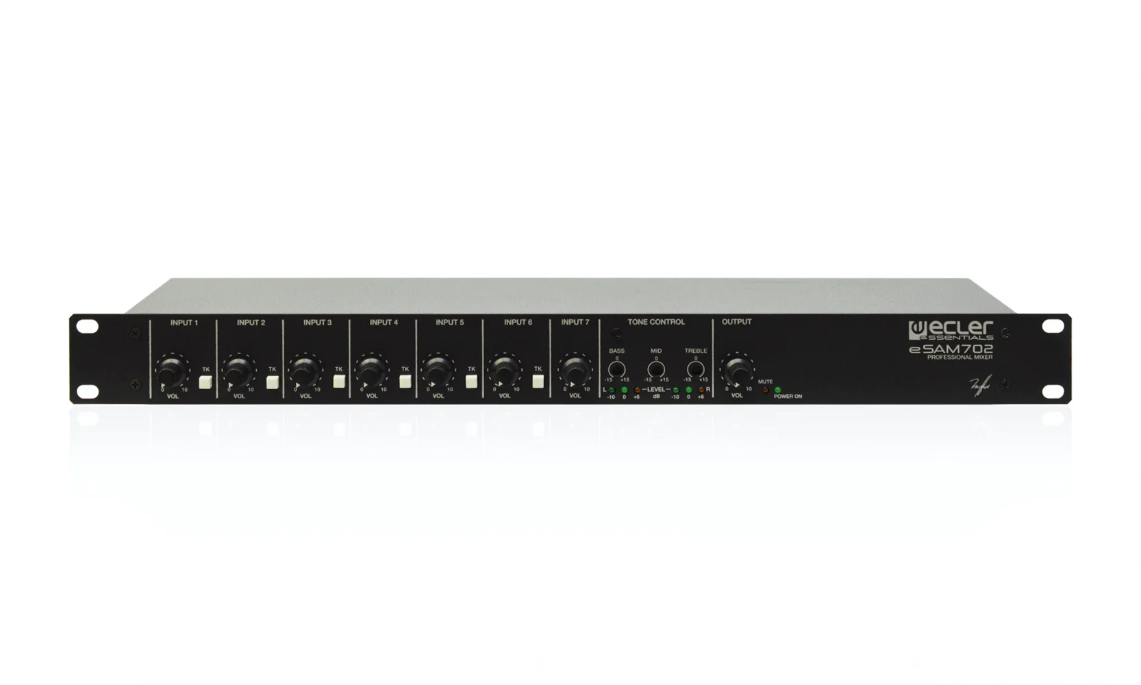 balanced output and one AUX/REC additional output. It includes a 3 band tone control section, Talkover (priority) function assignable to each MIC/LINE input over the mix bus, 18V phantom available for all mic inputs, ST/MONO mix switch and MUTE port for external dry contact triggering. Dimensions 482.6 x 44(1RU) x 120 mm. Weight 1,8 kg