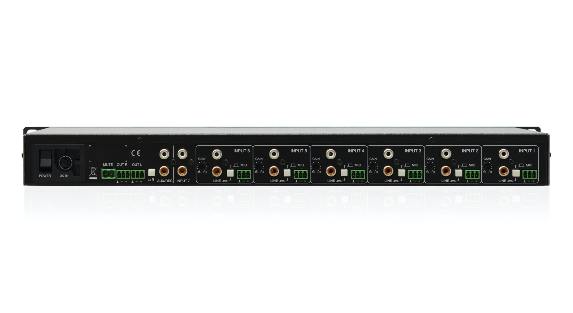 Installation audio mixer in standard rack format, featuring 6 MIC/LINE ST inputs, 1 LINE ST input, 1 main mix