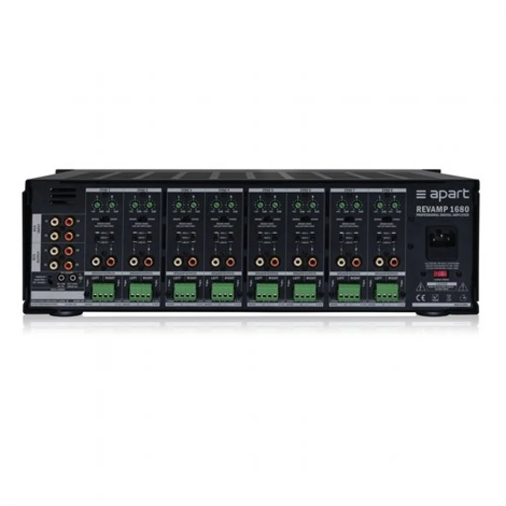 REVAMP1680, 4 ohm'luk 16 x 100 vat çıkış gücüne sahip profesyonel bir 16 kanallı dijital güç amplifikatörüdür, ancak cihaz 8 x 200 watt @ 8 ohm'a kadar köprülenebilir. Çok yüksek kanal ayırımına sahip olan bu 3 raf ünitesi yüksek amplifikatörün ayrıca toroidal güç transformatörlerine sahip çift bir analog güç kaynağı vardır. Bekleme güç tüketimi çok düşük, 0,5 watt'ın altındadır!