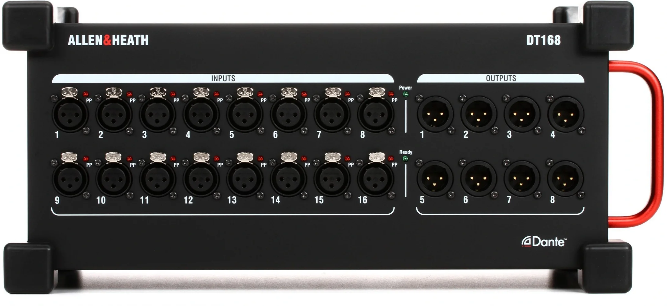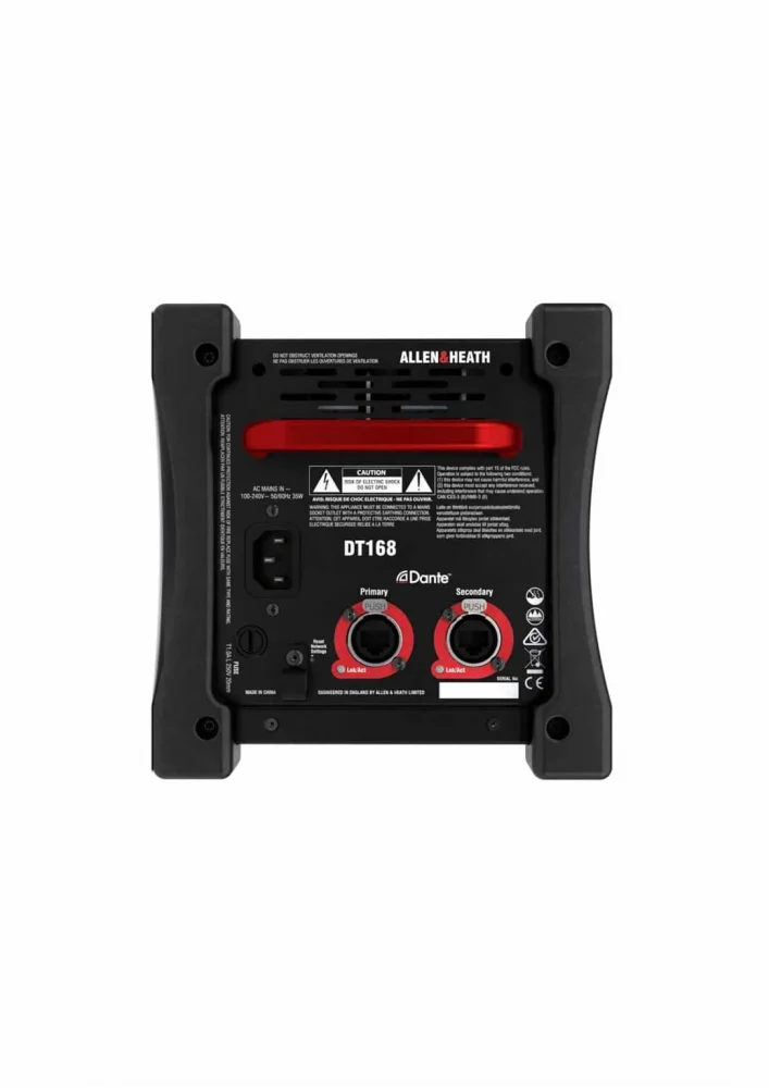 DT168, Dante'ye göre sınıfının en iyisi ses kalitesi için 96kHz dönüştürücülerle birlikte beğenilen Allen & Heath preamp'ların yanı sıra güvenli EtherCon konnektörleri aracılığıyla zincirleme bağlantı veya yedeklilik için Birincil ve İkincil bağlantı noktaları sunar.