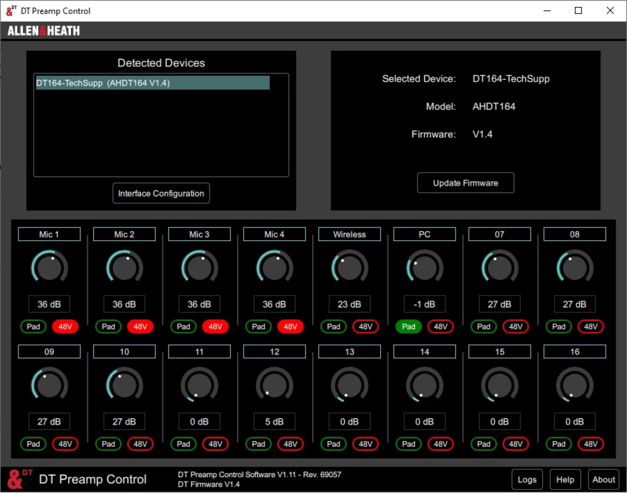 DT Preamp Control, birden fazla DT168 veya DT164-W Dante genişleticinin uzaktan kontrolüne olanak tanıyan bir Windows / macOS uygulamasıdır. Analog kazancın, fantom gücün ve Pad'in kontrolü soket başına sağlanır. Soket adları da Dante Controller'da görüntülenir ve düzenlenebilir.