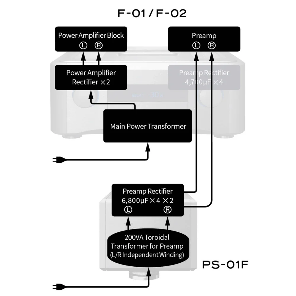 PS-01F, F-01/F-02 ön amplifikatör bölümünün ses devresi için özel olarak tasarlanmış bir dış güç kaynağıdır. Küçük sinyalleri işleyen ön amplifikatör bölümü ile hoparlörlere büyük akımlar gönderen güç amplifikatörü bölümünün birbirinden etkilenmemesi önemlidir. PS-01F'yi F-01/F-02'ye ekleyerek, ön amplifikatörün kapasitansı önemli ölçüde artırılır ve amplifikatörün ana redresöründen net bir şekilde ayrılır, böylece kullanıcı, ayrı bir güç kaynağına sahip amiral gemisi ön amplifikatörümüz Grandioso C1X'i anımsatan, müziğin en ince ayrıntılarını ve dinamiklerini deneyimleyebilir.