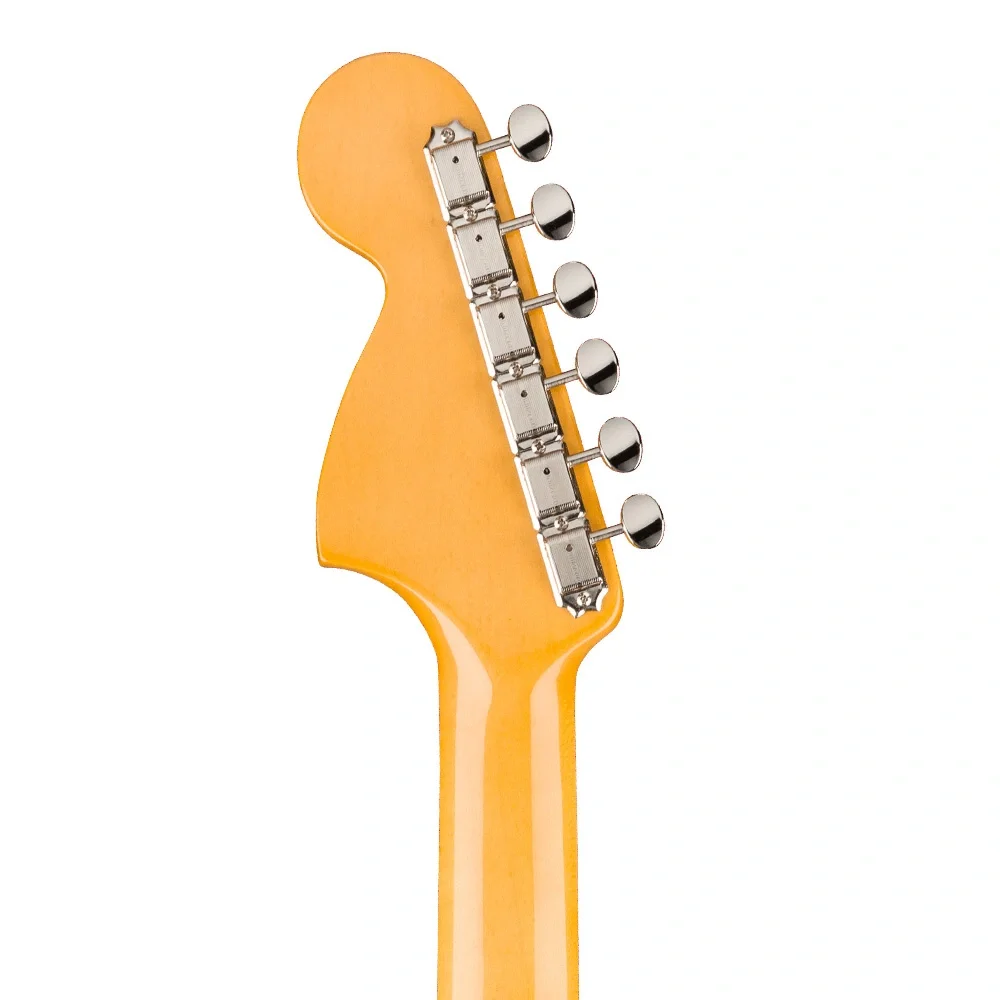 American Vintage II 1966 Jazzmaster, 7,25" yarıçaplı yuvarlak lam gülağacı klavye ve vintage uzun perdelerle rüya gibi çalan rahat bir "C" şekilli akçaağaç sapa sahiptir. 1966'daki üretimin karakteristik özelliği olan bu gitar, beyaz sap binding, sedefli blok işlemeler, tek hatlı "Fender Deluxe" akort burguları ve eşleşen boyalı headstock (sadece özel renklerde) ile sunulmaktadır. Patentli "floating" tremolo, dişli saddle'lara sahip ayarlanabilir köprü ve özel ritim ve lead devrelerine bağlı Pure Vintage '66 Jazzmaster manyetikler klasik ton ve otantik Fender hissi sunar.