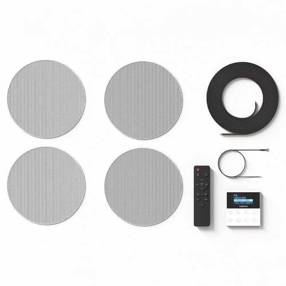 Her biri ABS gövdeye sahip 8 Ohm’luk 4 adet 6” hoparlör ile donatılan set, 25+25 Watt RMS @ 4Ω çıkış gücüyle yüksek kaliteli stereo ses sunar. Hoparlörler, çerçevesiz alüminyum ızgara yapısıyla sade ama şık bir görünüm sağlar. 4×5 metre hoparlör kabloları, uzaktan kumanda ve FM anten kablosu ürünle birlikte sunularak kutudan çıktığı anda kullanıma hazır bir sistem sunar. Toplam sistem ağırlığı 2.3 kg olup, amplifikatör ve hoparlör ölçüleri de standart duvar boşluklarına ve tavan kesitlerine uyumludur.
