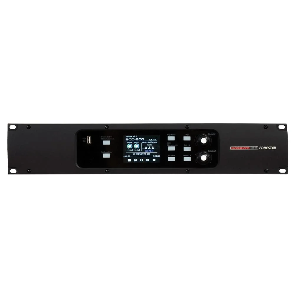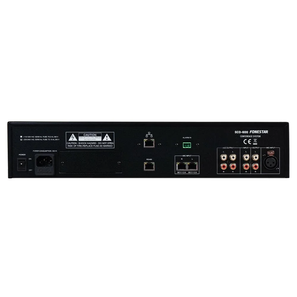 Fonestar SCD-600, profesyonel donanım estetiğini yüksek mühendislikle birleştiren bir tasarıma sahiptir. 19” rack uyumlu metal gövde (2U yüksekliğinde) uzun süreli kurulumlarda stabilite sağlar. Üzerinde yer alan LCD ekran, ses seviye düğmeleri ve aydınlatmalı kontrol tuşlarıyla kullanıcı dostu bir arayüz sunar. Arka paneldeki bağlantı noktaları, sistemin modüler olarak genişletilmesine olanak tanır. Cat 5e / Cat 6 ağ kabloları ile bağlantı kurulur; bu, hem düşük maliyetli hem de kolay kurulum avantajı sağlar. Sistem, 230/115 V AC güç girişine sahiptir ve 350 W gücünde çalışır. Sağlam gövde yapısı, yoğun kullanım gerektiren konferans salonları, belediye meclisleri, üniversite senatoları ve kongre merkezleri için uzun ömürlü kullanım garantisi sunar.