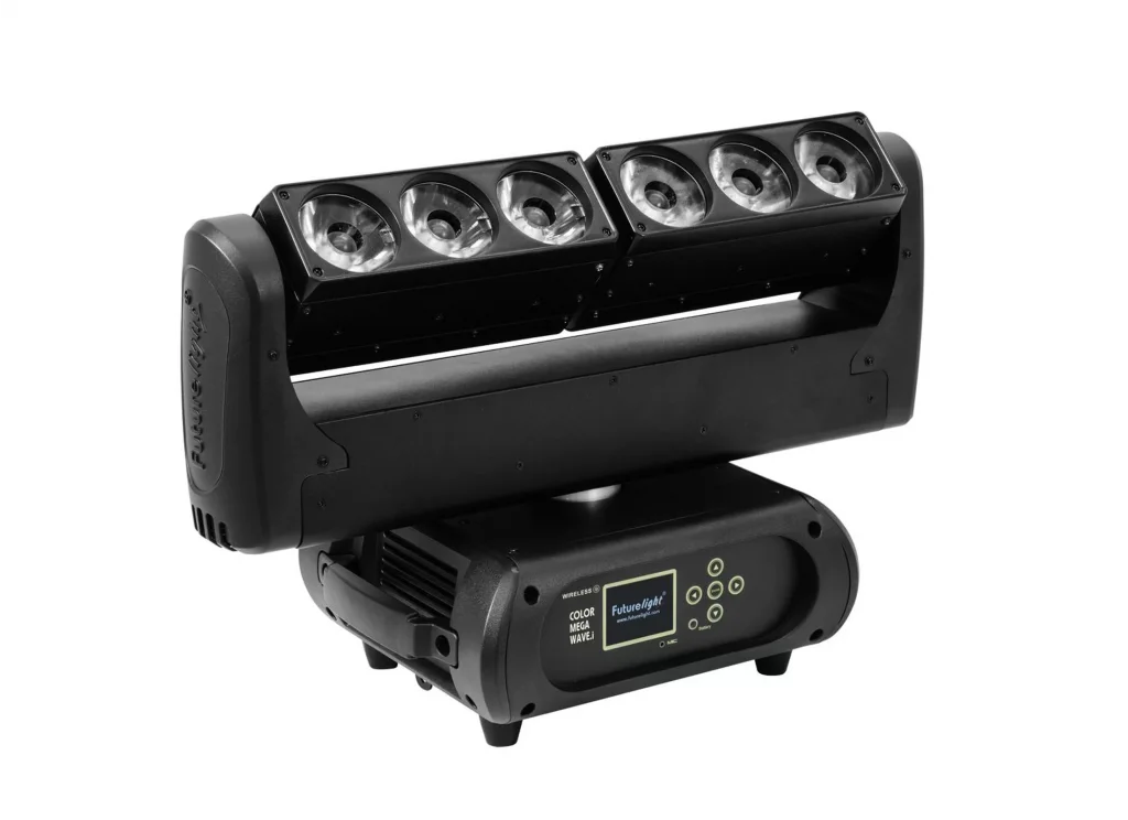 Bir kafa, iki bar, her biri üç LED ve gerçekten özel bir şey: iki barın pan dönüşü bir ve aynıdır, ancak eğim hareketleri ayrı ayrı kontrol edilebilir. Bu nedenle ortaya çıkan görseller, klasik desenlere taze bir hava getiriyor ve biraz dalga hareketlerini hatırlatıyor, dolayısıyla ürün adı. Altı adet 20 watt LED'li çok güçlü bir soğuk beyaz versiyonun yanı sıra, 10 watt 4'ü 1 arada LED'li renkli bir versiyon da vardır - Tüm ışınlar 2,5°'lik bir ışın açısına sahiptir ve ışın gösterileri için mükemmel şekilde uygundur.