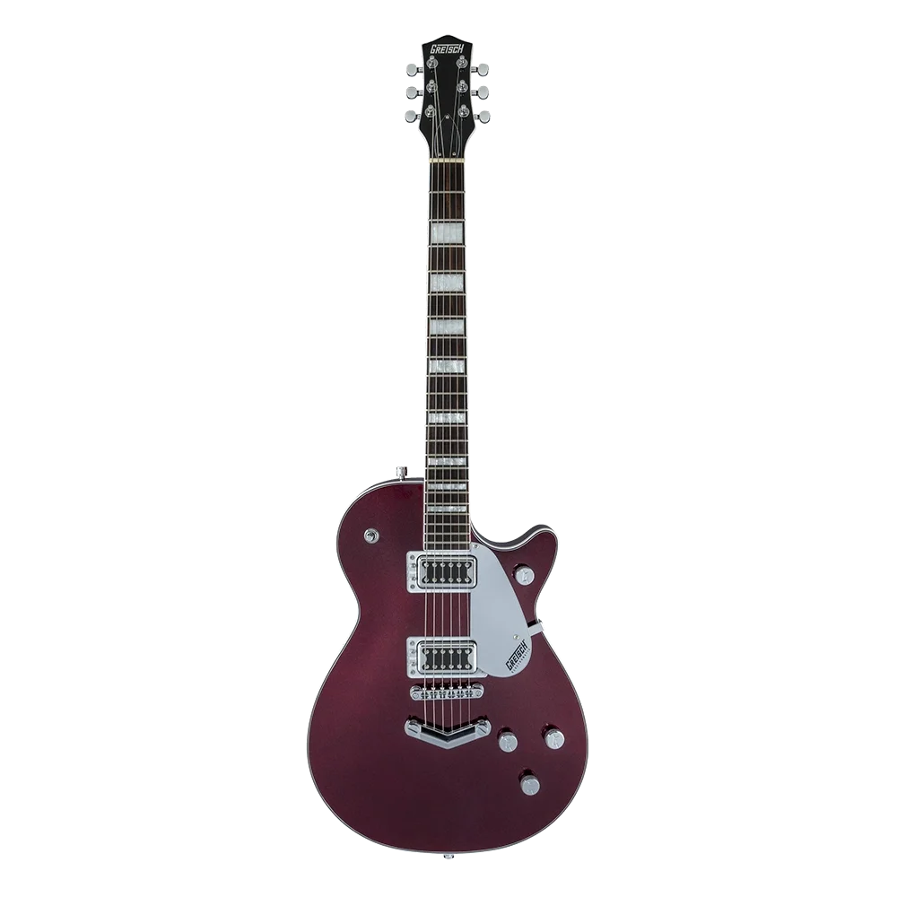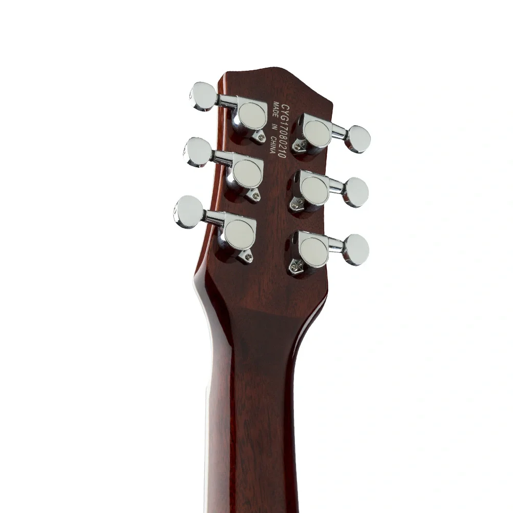 Güçlü bir ses profili ve olağanüstü akustik denge için akçaağaç üst kısım ile yükseltilmiş odacıklı maun gövdeZahmetsiz erişim ve performans için alt set maun sap22 orta jumbo perdeli 12" yarıçaplı defne klavyeÇift Black Top Broad'Tron™ manyetiklerTreble bleed devresine sahip ana volüm, ana ton ve her bir manyetiğe özel manyetik volüm kontrolleriGretsch V-Stoptail tailpieceSabit Adjusto-Matic™ köprüDiğer özellikler arasında ciltli headstock, düz yüzlü headcap, vintage esintili purfling, Big Block sap işmeleri ve kapalı arka akort burguları bulunurKrom donanımGÖVDE Gövde AğacıMaun / Üst, Lamine AkçaağaçGövde CilasıParlakGövde ŞekliJet™SAP Sap AğacıMaunSap CilasıParlak ÜretanSap ŞekliThin "U"Tel Boyu24.6" (625 mm)Tuşe AğacıDefneTuşe Yarıçapı12" (305 mm)Perde Sayısı22Perde BoyutuOrta Boylu JumboÜst EşikSentetik KemikÜst Genişliği1.6875" (42.86 mm)Sap İşlemesiSedefli Büyük BloklarELEKTRONİK Köprü ManyetiğiBlack Top Broad’Tron™Sap ManyetiğiBlack Top Broad’Tron™KontrollerVolum 1. (Sap Manyetiği), Volum 2. (Köprü Manyetiği), Ana Volum (Treble Bleed ile), Ana TonManyetik Seçici3 Konumlu: