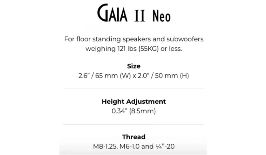 Fabrika çıkışlı ayakların veya sivri uçların yerini alacak şekilde tasarlanan GAIA Neo, hoparlörü destek yüzeyinden ayırarak titreşim ve yansımalardan kaynaklanan bozulmaları ortadan kaldırır. GAIA Neo ile ses sisteminizin tüm potansiyelini ortaya çıkarmak her zamankinden daha kolay.
