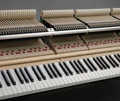 Piyanonun masif yapısı, tel gerginliğini desteklemek için sağlam bir temel oluşturur. Şase yapısının kalınlığı, kararlı akort ve güçlü ton sağlamak için tasarlanan bu sağlam çerçevenin yapısal bütünlüğünü örneklendirir.