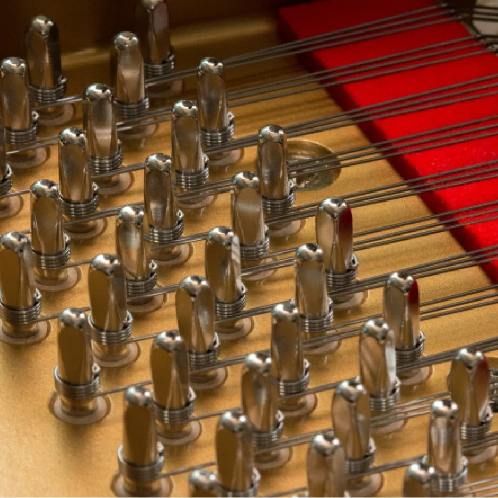 Piyanonun masif yapısı, tel gerginliğini desteklemek için sağlam bir temel oluşturur. Şase yapısının kalınlığı, kararlı akort ve güçlü ton sağlamak için tasarlanan bu sağlam çerçevenin yapısal bütünlüğünü örneklendirir.