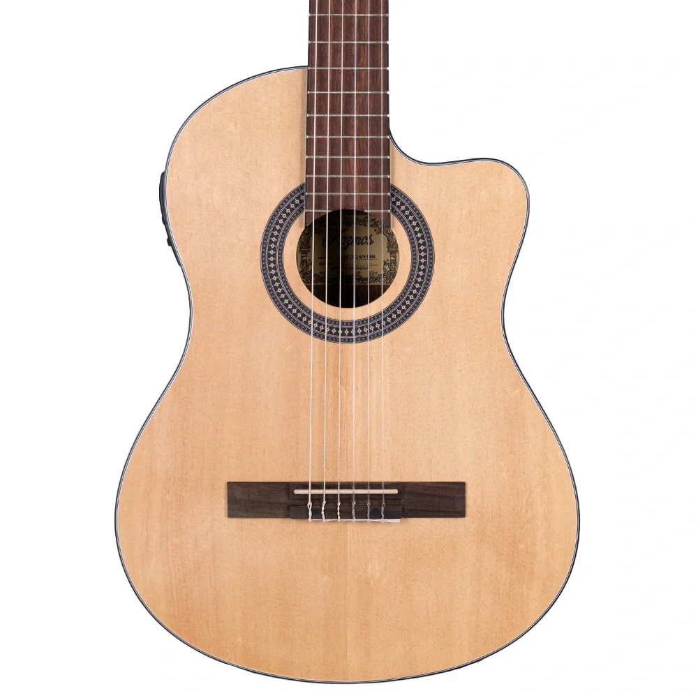 Kozmos IC-100 CE serisi, başlangıç seviyeli ulaşılabilir fiyatı ve kesik gövde yapısıyla elektro klasik performanslarını sizlere sunuyor. Bu gitarların yapımında kullanılan işçilik ve materyal kalitesiyle, kesik gövde yapısı ve yüksek kalitedeki EQ-4T manyetik sistemiyle her türlü ses sisteminde en iyi sesleri alabileceğiniz şekilde tasarlandı. Bu modelin gövdesinin arka ve yan kısımlarında kullanılan beyaz sedir ağacı ailesinden olan Mindi ağacı, gitarınızın bas seslerinde ve en yüksek frekanslı seslerinde dengeli ses seviyesini sağlayacaktır. Birçok klasik gitar için kullanılan ön ses tahtası seçimi olan Ladin, geniş bir dinamik aralık oluşturur ve çok yönlü bir çalım stili aralığını barındırır.