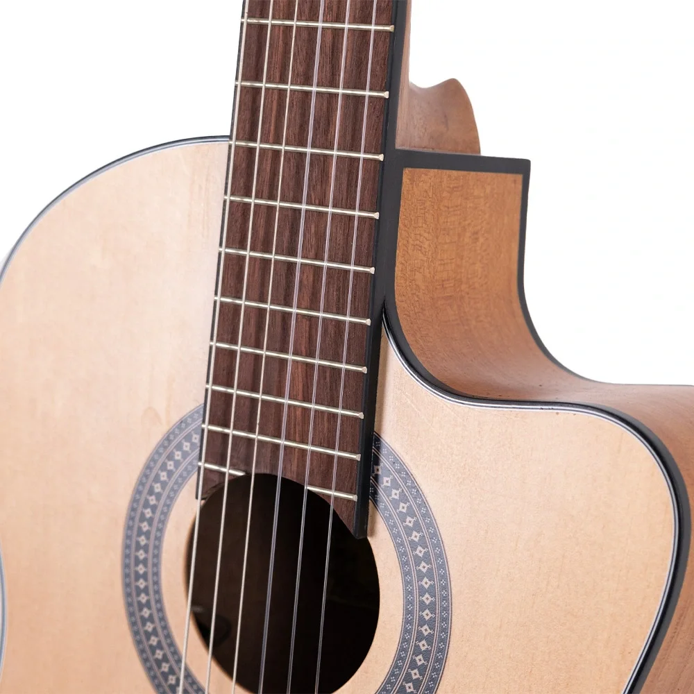 Uygun fiyatlı veya yarı-profesyonel gitarların çoğunda bile bulunmayan sap içerisine yerleştirilmiş çelik mil, size uzun yıllar boyunca formu bozulmadan çalabilmenizi sağlayacaktır. Sap içerisindeki bu çelik mil sayesinde gitarınız ısı ve nem farklılıklarına maruz kaldığında kolayca ayar yaparak, istediğiniz formda tutabilmenize imkan verecektir. Klasik gitar konusunda son derece seçici olan gitaristlerin bile sevebileceği rahat ve ergonomik sap formu sayesinde, en zor pozisyonlarda bile kullanıcıya rahat çalım imkanı sağlayabilmektedir. Gitarın ön ve arka kapaklarını çevreleyen siyah renkteki binding işçiliği, kusursuzca sap işçiliğinde de kullanılarak gitarınıza çok daha şık ve zarif bir görünüm kazandırmaktadır. Eşik altındaki piezo manyetikle birlikte EQ-4T sistemi sayesinde gitarınızın Volume Presence / Bass / Mid / Treble frekans kontrollerini kolaylıkla yapabilir ve her türlü ses sisteminde performansınızı sıcak gösterecek tonları yakalayabilirsiniz. EQ sistem üzerinde bulunan akort cihazı ile gitarınızı ister evinizde, ister sahnenizde kolaylıkla akort edebilmenizi sağlayacaktır. EQ sistemi üzerindeki “Phrase” düğmesi sayesinde, gitarınızı amfiye veya bir ses sistemine bağladığınızda elektriğin topraklamasından kaynaklanabilecek dip gürültüleri kesebilirsiniz.