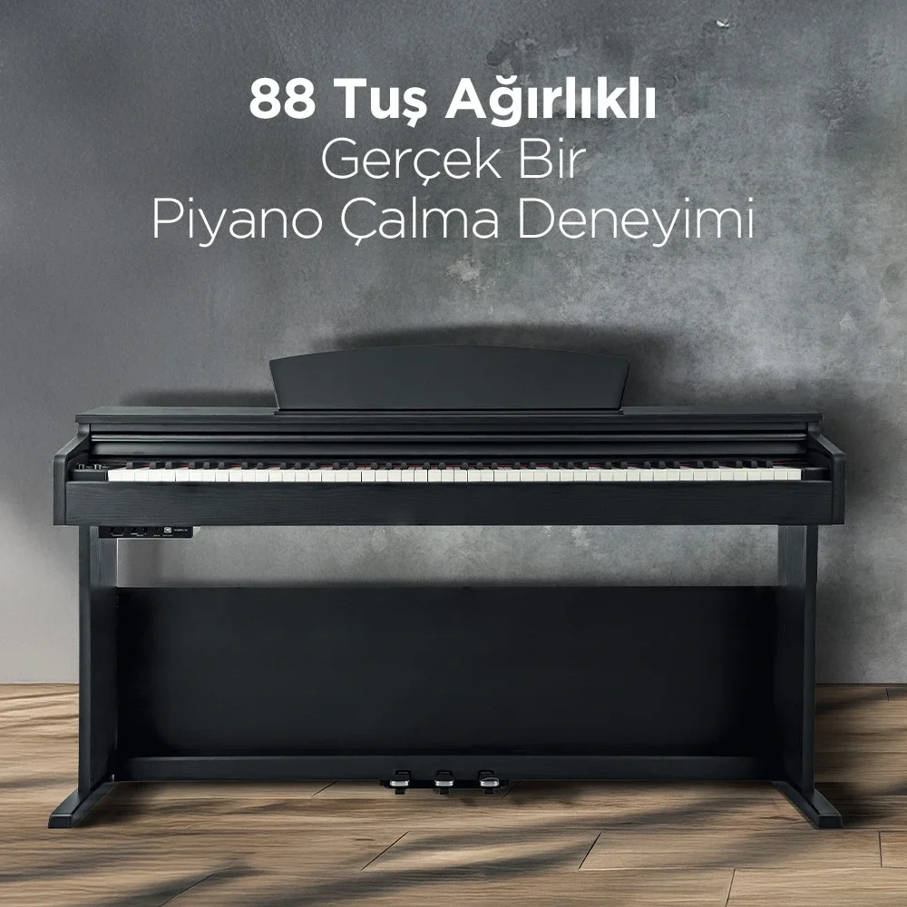 Teknik Özellikler Sesler30 Farklı Enstrüman SesiKlavye88 Tuş (Soldan Sağa Farklı Ağırlaştırılmış Çekiç Mekanizmalı)Tuş Hassasiyeti6 Farklı Aralıkta AyarlanabilenPedallarSoft, Sostenuto, Sustain (yarım-damper)EkranLED EkranPolifoni128 SesSes KontrolüBass ve Treble Frekans Kontrolü, Bass ve Treble Frekansı Ses Seviye KontrolüTwin PianoVarEfektlerReverb, ChorusDiğer FonksiyonlarSplit Modu, Katmanlı Ses Modu (Layer), Octave, Transpose, Akort ve Pan AyarlarıDemo Şarkılar16Şarkı Kayıtİki ayrı kanalda kayıt yapabilmeBluetooth Ses AktarımıVarMIDITransmit Ayarları Local KontrolüBağlantılarKulaklık Çıkışı x 2 Adet USB MIDI, USB AUDIO MIDI Çıkışı AUX Girişi LINE ÇıkışıSes ve Ayar Kayıt HafızasıVar - 4 AdetHoparlör16 W (2 x 8 W)MetronomÖlçü başları ayarlanabilen 2/2, 1/4, 2/4, 3/4, 4/4, 5/4, 6/4, 3/8, 6/8, 7/8, 9/8, 12/8Tempo10-300 Bpm Arasında AyarlanabilirÖlçülerGenişlik: 139,2 cm - Derinlik: 42,4 cm - Yükseklik: 83,3 cmAğırlık43,4 Kg