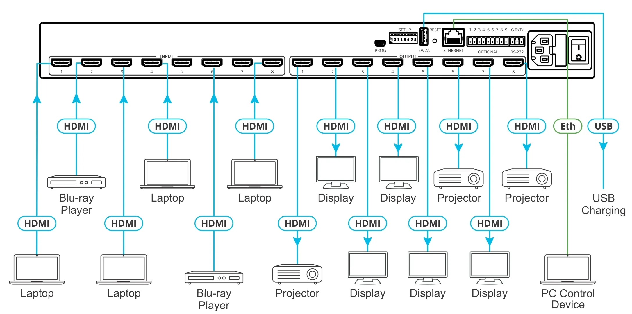 - 8x HDMI (dişi HDMI konnektör)